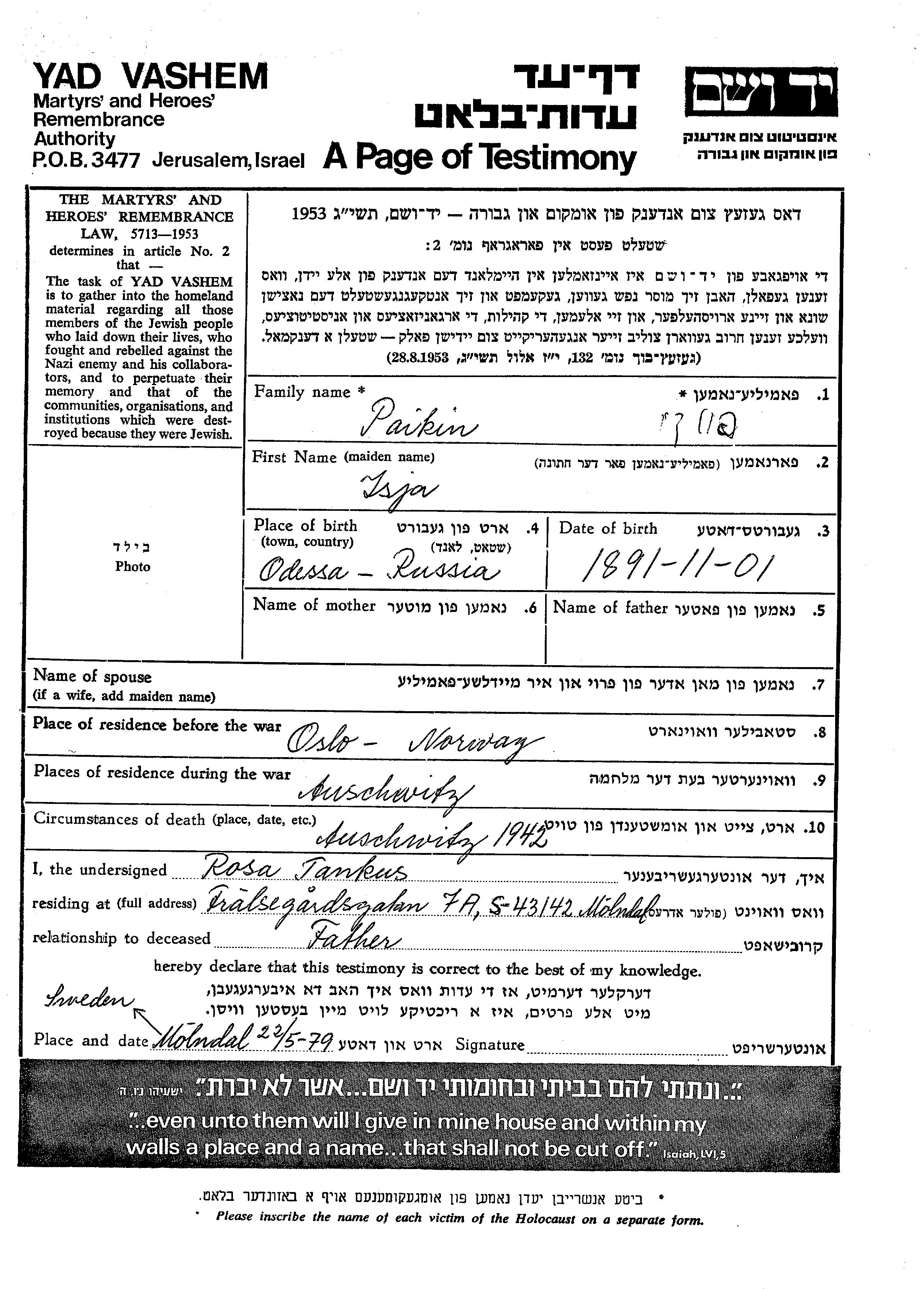 Isja wurde in der Schoah ermordet. Todesort: Auschwitz, Polen im Jahr 1942.