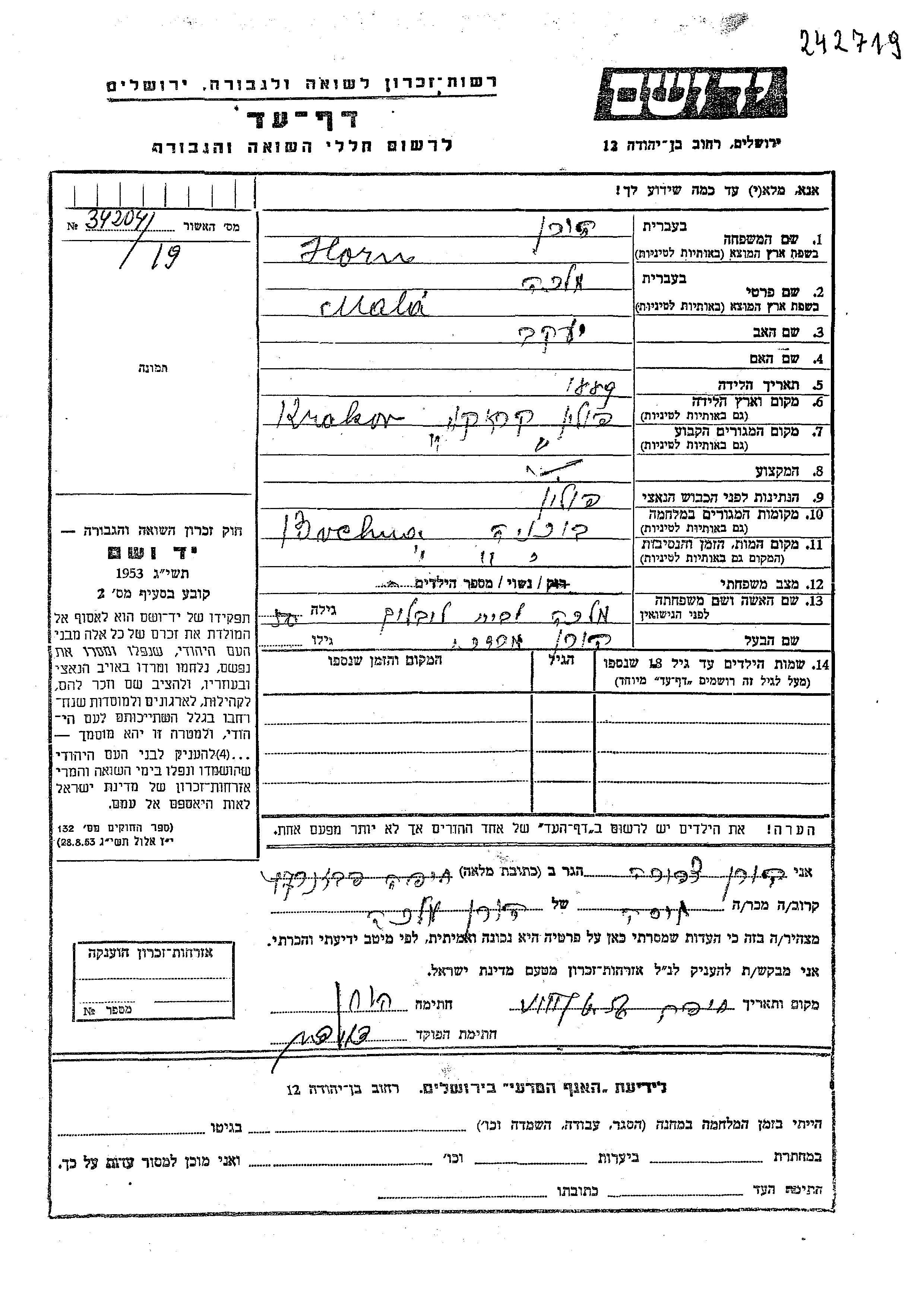 Mala Horn, geb. Liblikh wurde im Jahr 1889 in Krakow, Polen geboren. Sie war die Tochter von Yaakov. Sie war mit Mordekhai Verheiratet. Vor dem Zweiten Weltkrieg lebte sie in Krakow, Polen. Während des Krieges war sie in Bochnia, Polen.