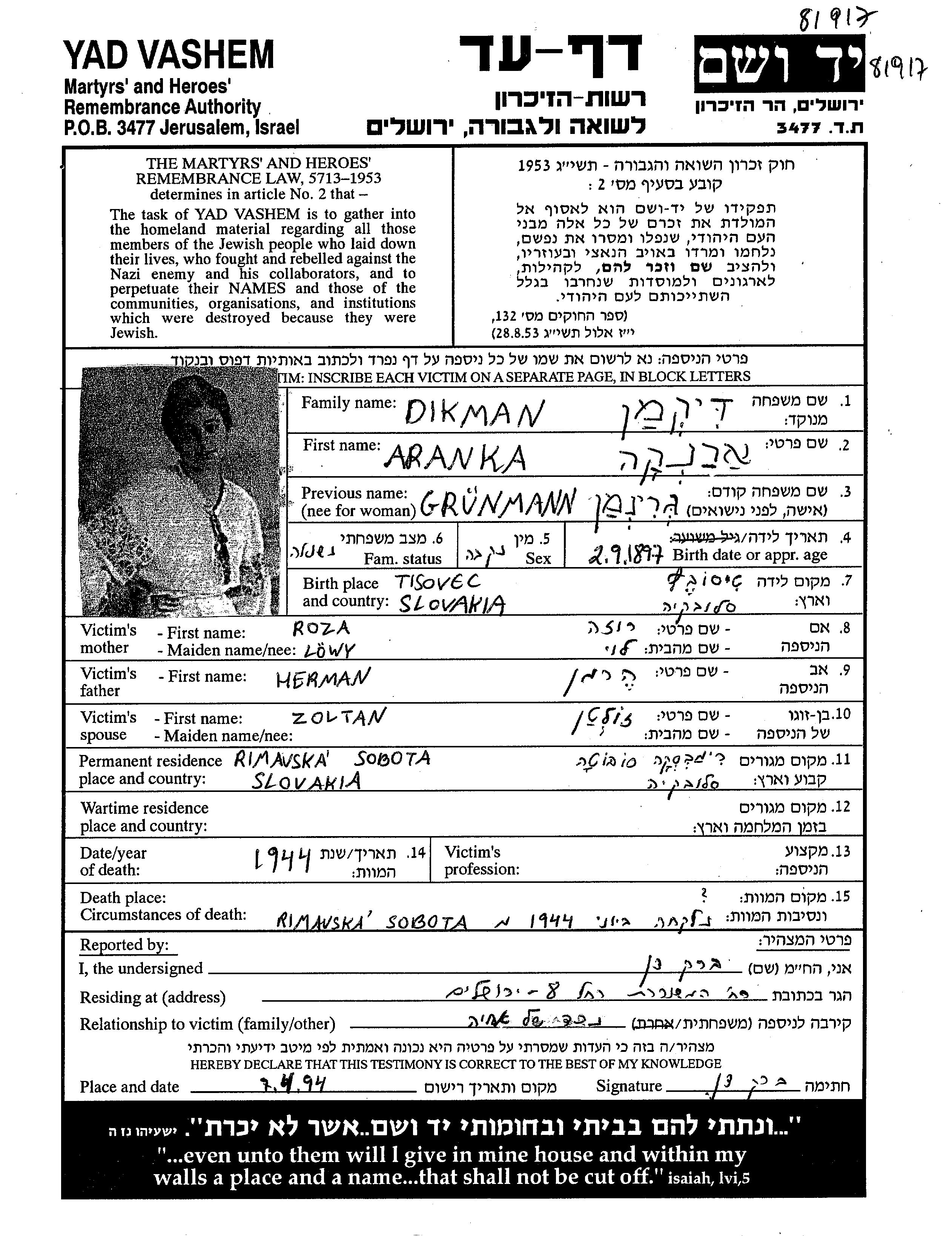 Aranka Dickmann, geb. Grünmann wurde im Jahr 1897 in Tisovec, Tschechoslowakei geboren. Vor dem Zweiten Weltkrieg lebte sie in Rimavska Sobota, Tschechoslowakei.