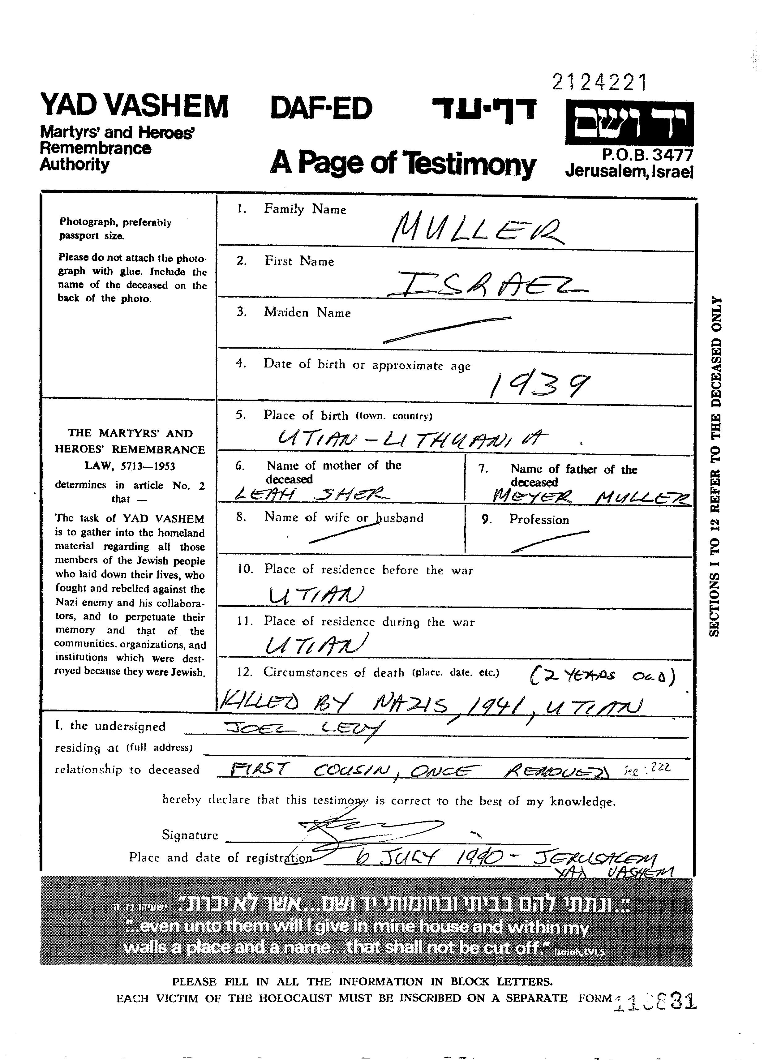 Yisrael Muller wurde im Jahr 1939 in Utena, Litauen geboren. Vor dem Zweiten Weltkrieg lebte er in Utena, Litauen.