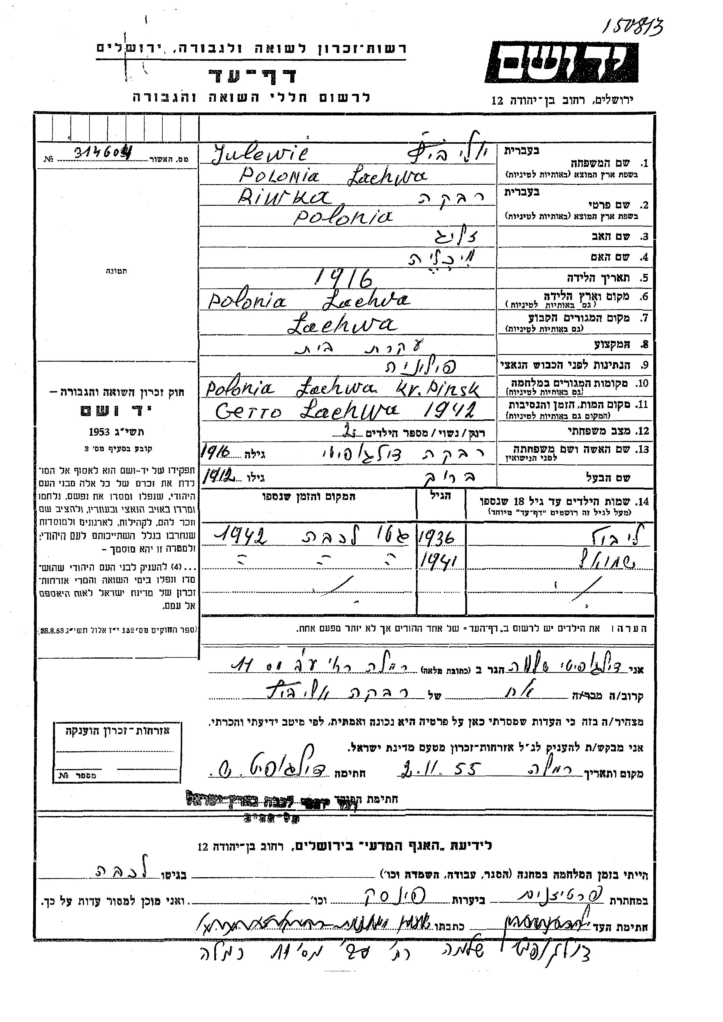 Rivka Julewic, geb. Dolgopiati wurde im Jahr 1914 in Lachwa, Polen geboren. Sie war Hausfrau. Vor dem Zweiten Weltkrieg lebte sie in Lachwa, Polen.