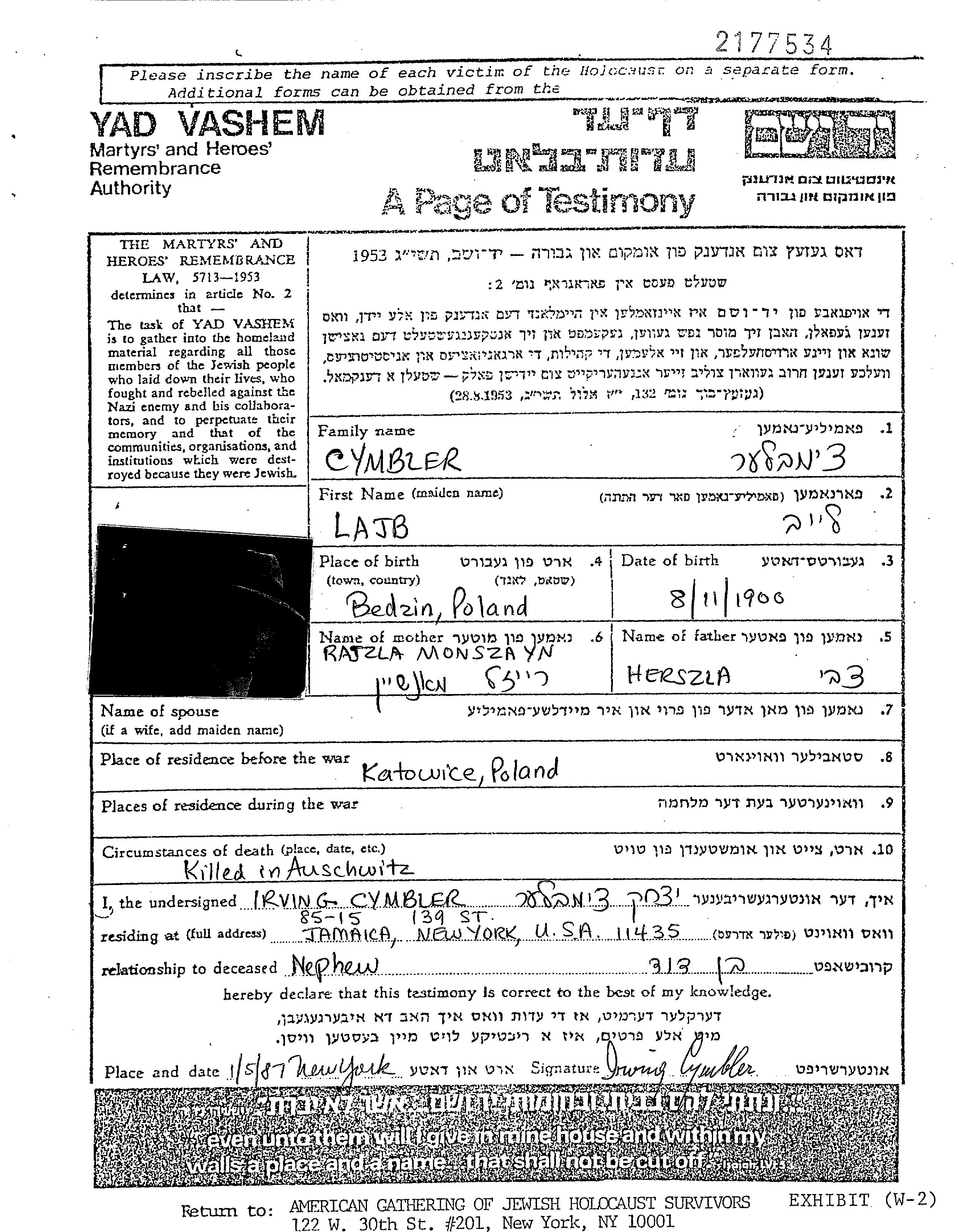Leib Leon Cymbler wurde im Jahr 1898 in Będzin, Polen geboren. Er war Kaufmann/-frau. Vor dem Zweiten Weltkrieg lebte er in Katowice, Polen.
