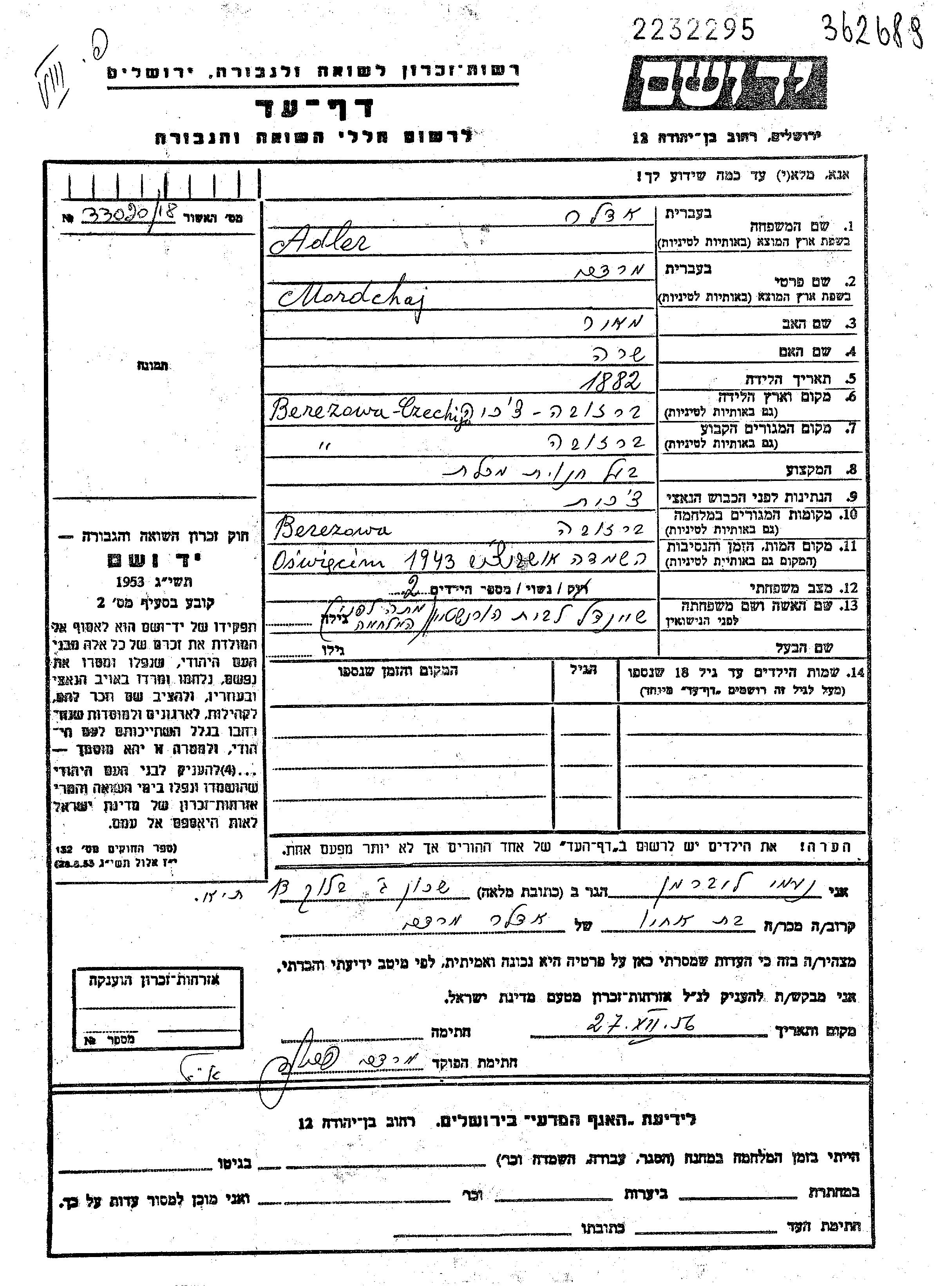 Adler | Mordchaj | 1882 | Berezovo, Tschechoslowakei | Gedenkblatt |