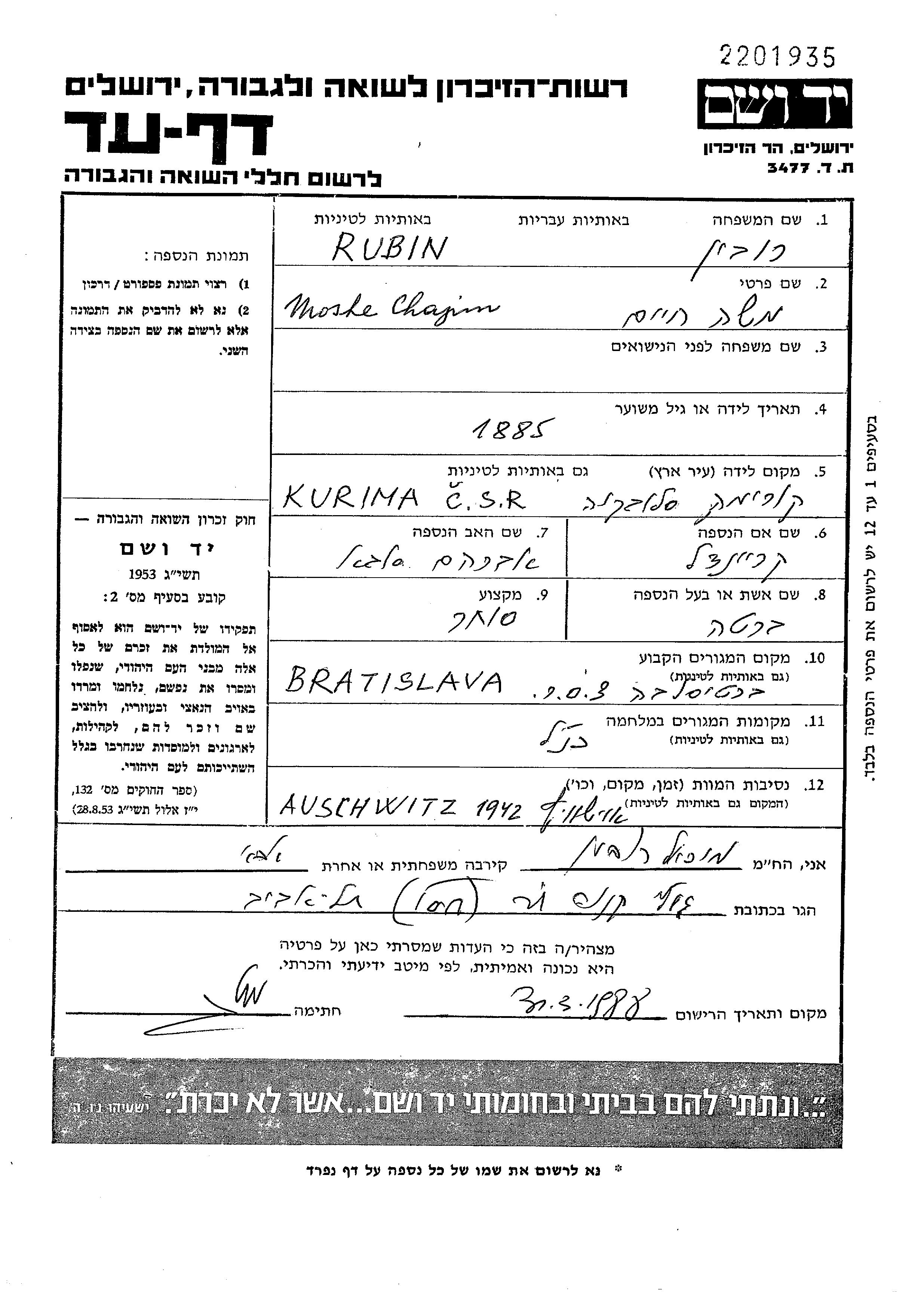 Rubin | Chajim Moshe | 1885 | Bratislava, Tschechoslowakei | Gedenkblatt |