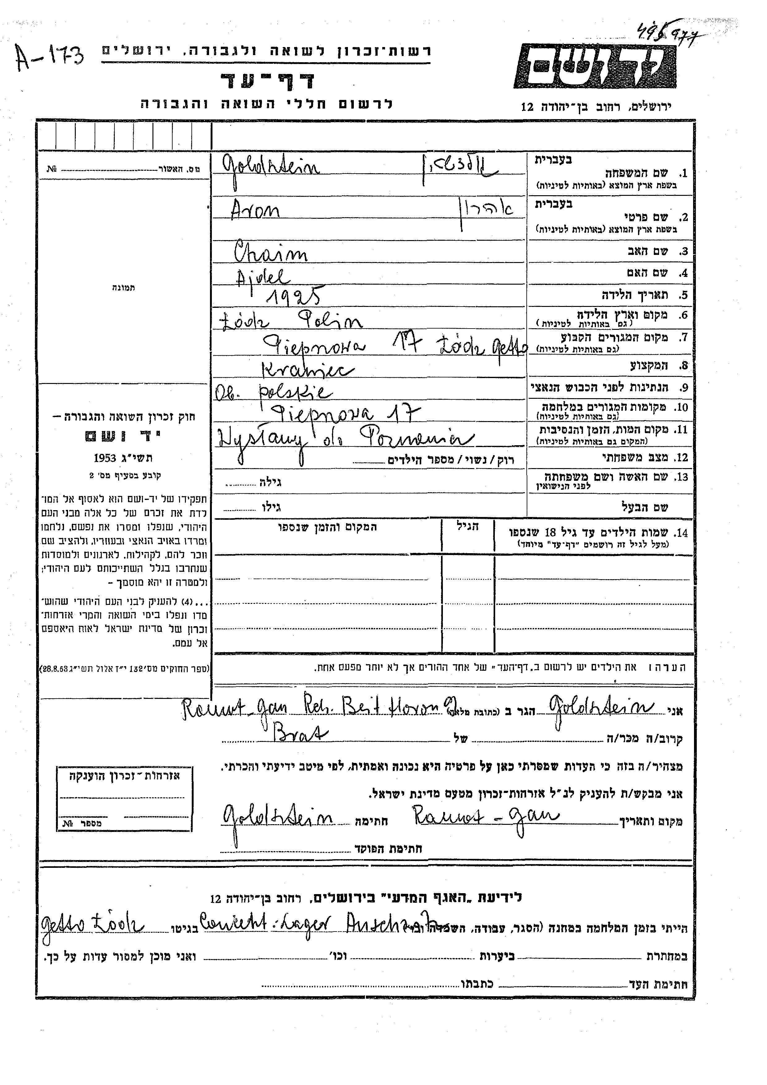 Aharon Goldstein wurde im Jahr 1924 in Lodz, Polen geboren. Er war Schneider. Vor dem Zweiten Weltkrieg lebte er in Lodz, Polen.