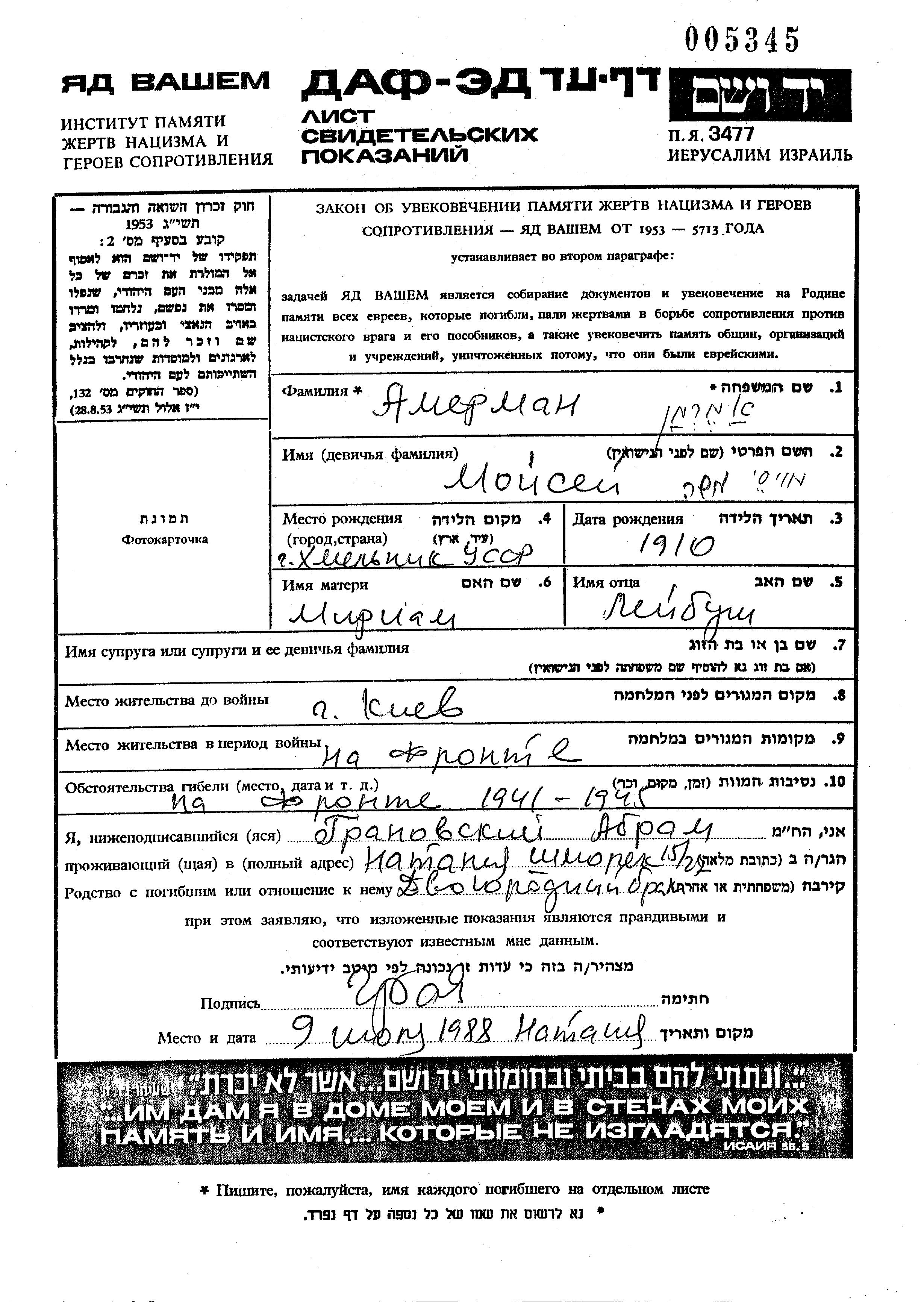 Moshe Emerman Amerman wurde im Jahr 1910 in Khmelnik, Ukraine (UdSSR) geboren. Vor dem Zweiten Weltkrieg lebte er in Kiyev, Ukraine (UdSSR).