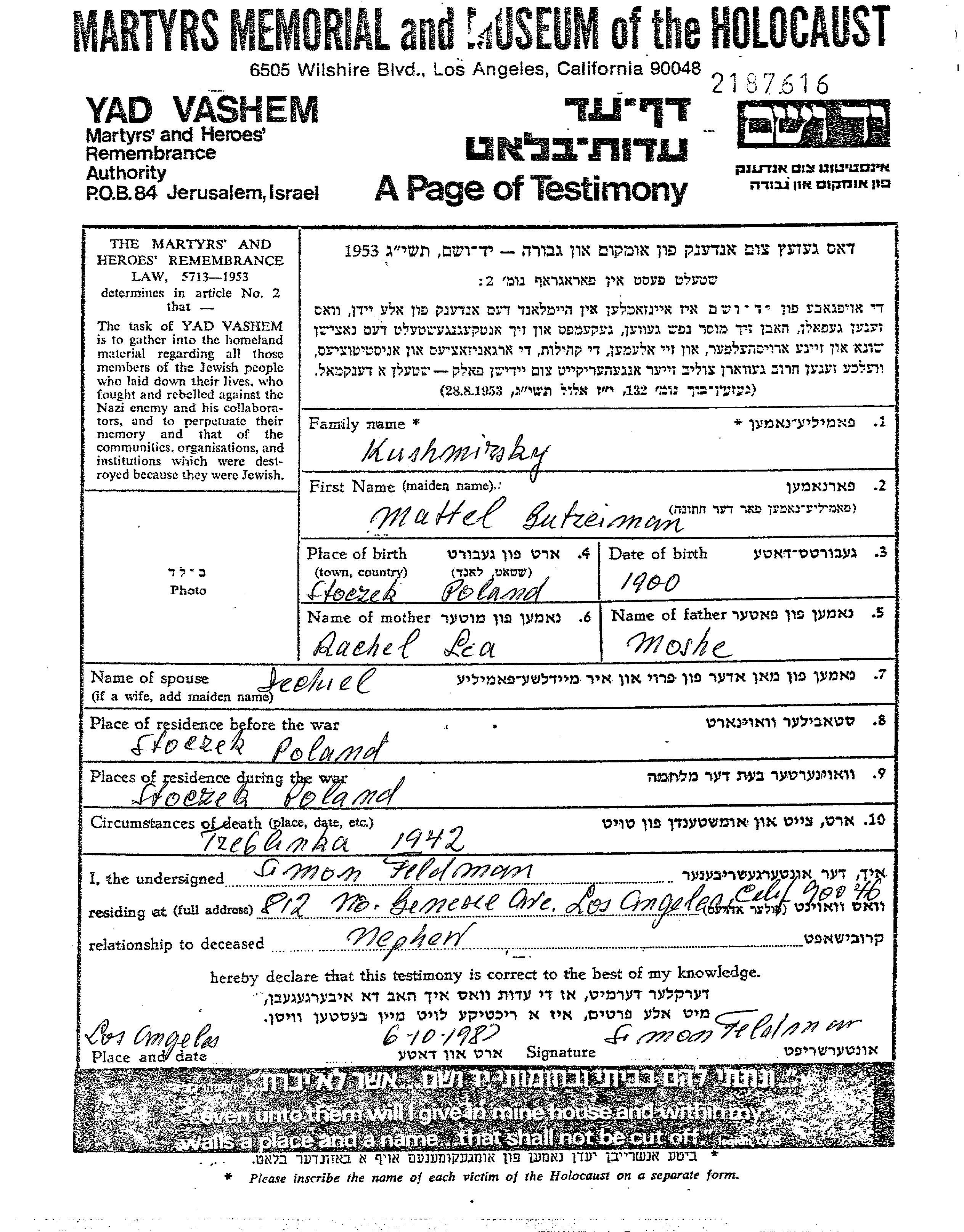 Matil Mate Kushmirsky, geb. Gutreiman Butzman wurde im Jahr 1900 in Stoczek, Polen geboren. Vor dem Zweiten Weltkrieg lebte sie in Stoczek, Polen.