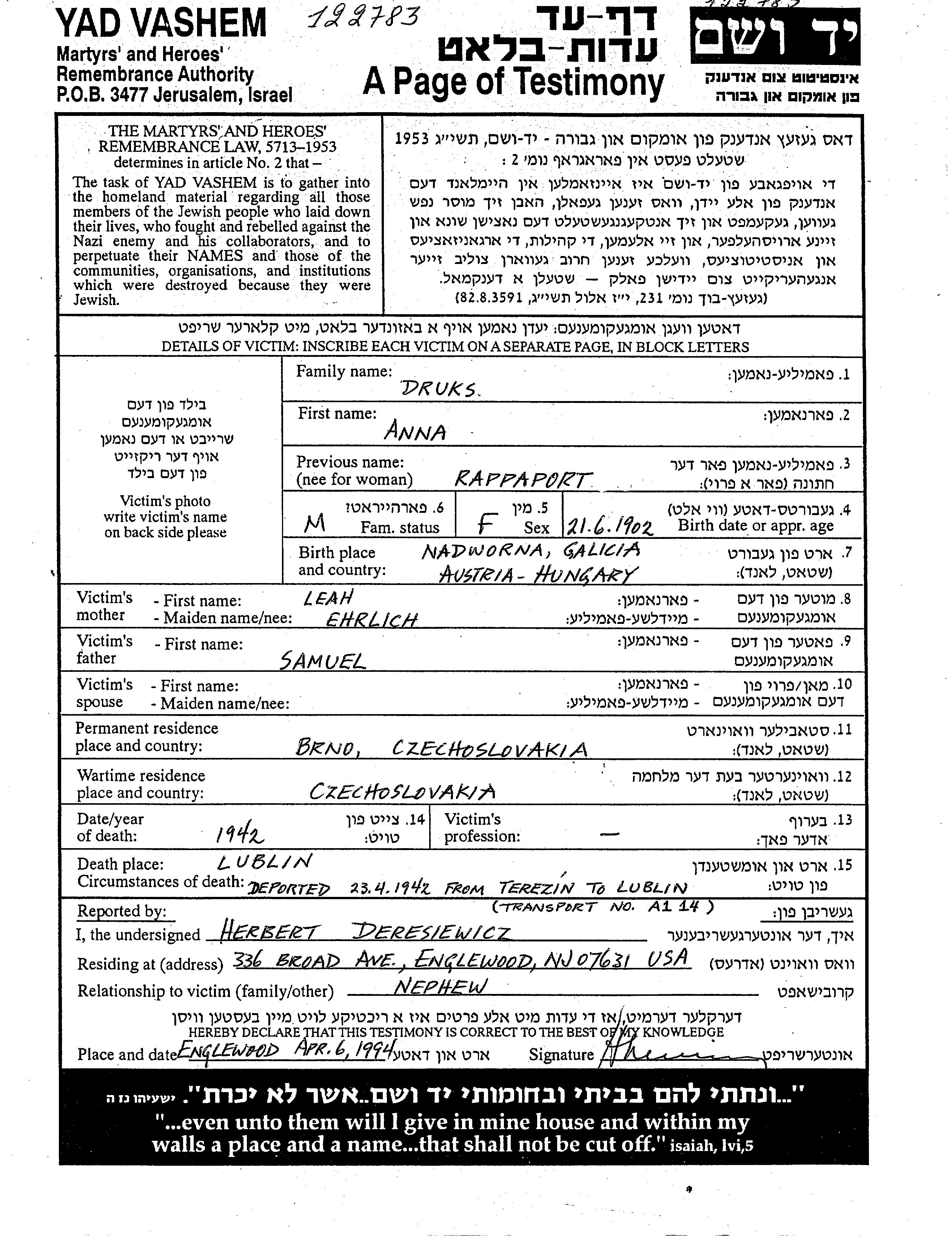 Ana Druks, geb. Rappaport wurde im Jahr 1902 in Nadworna, Polen geboren. Vor dem Zweiten Weltkrieg lebte sie in Brno, Tschechoslowakei.