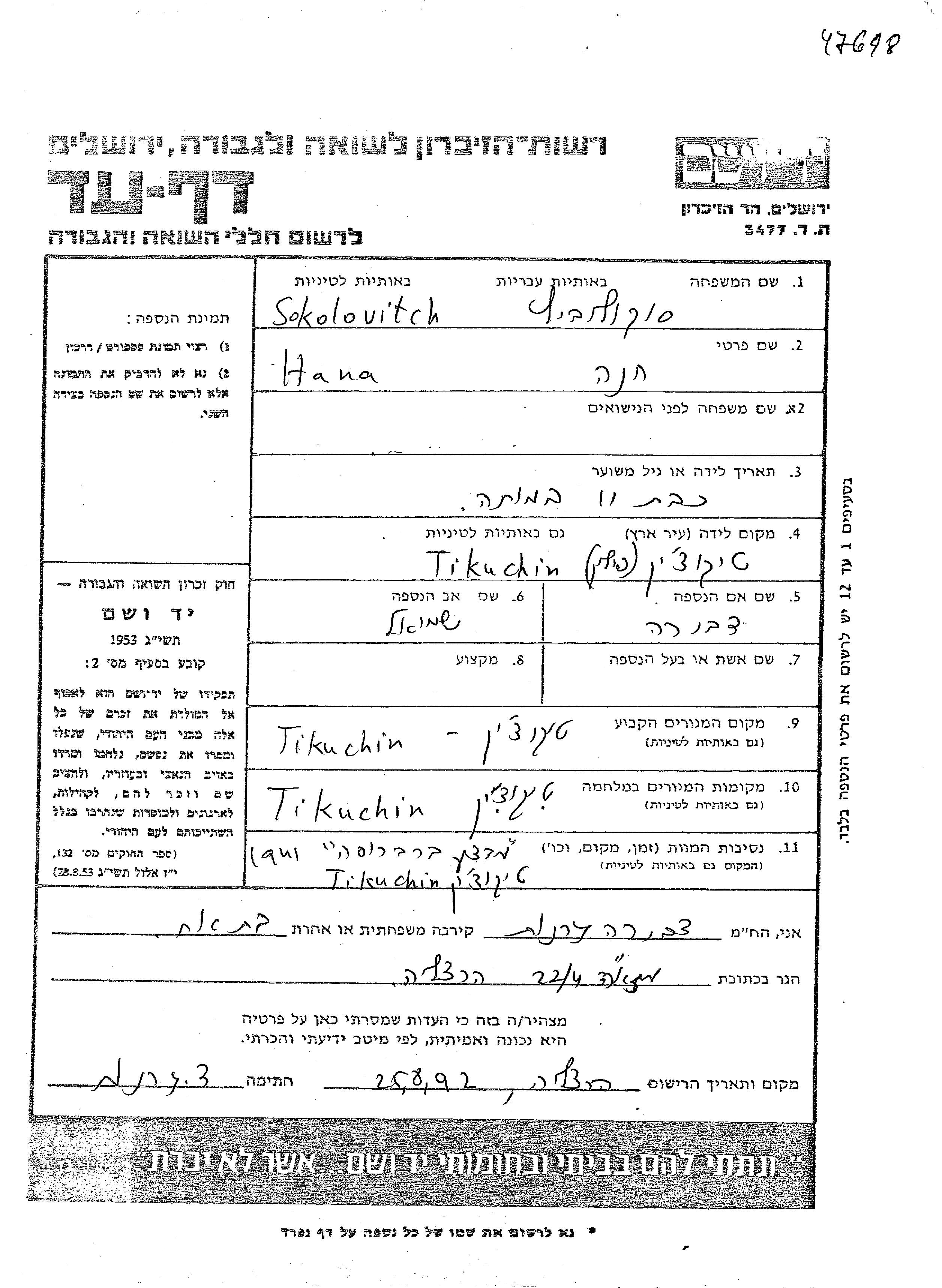 Khana Sokolovitch wurde in Tykocin, Polen geboren. Vor dem Zweiten Weltkrieg lebte sie in Tykocin, Polen.