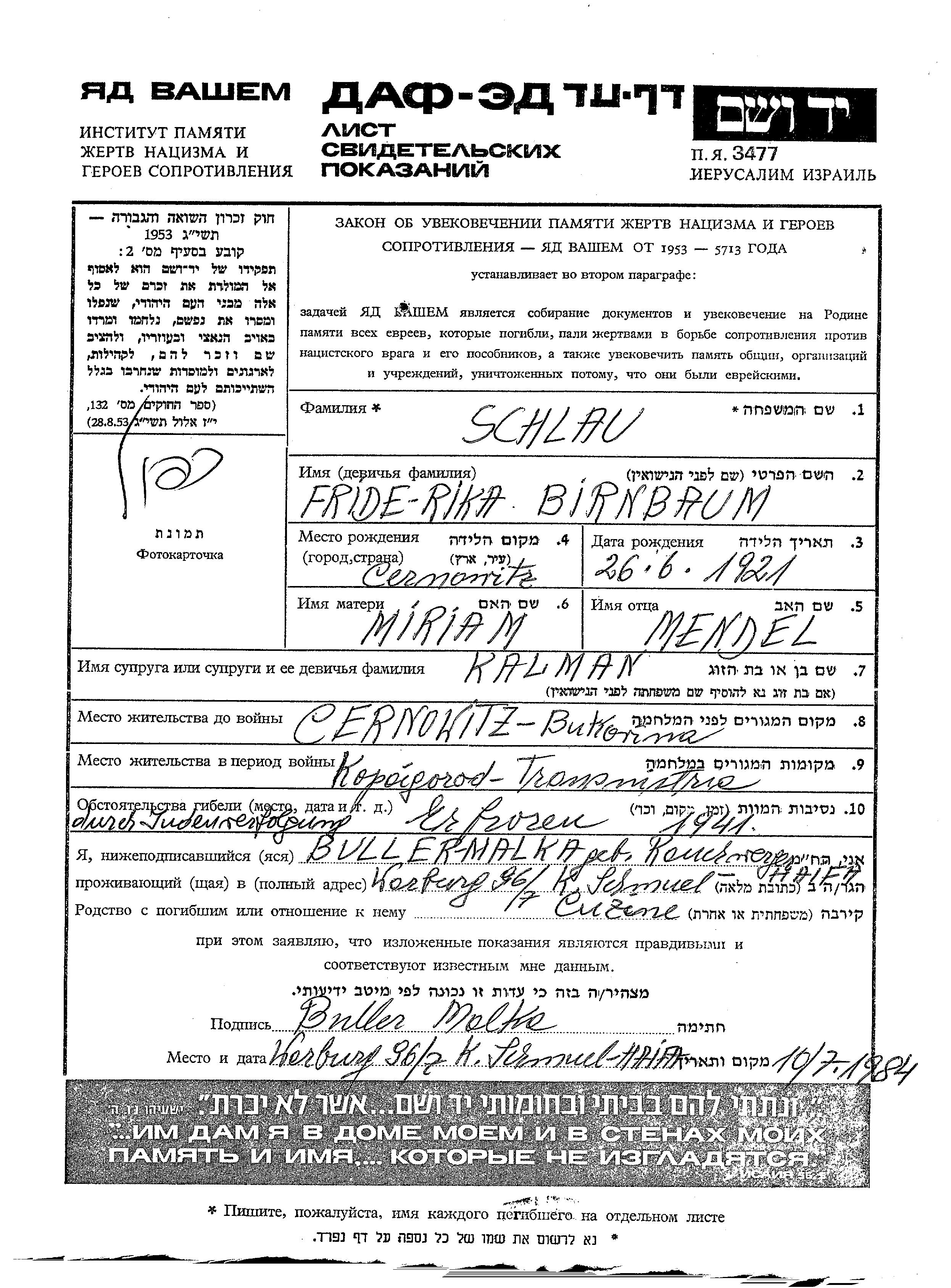Rika Frida Schlau, geb. Birnbaum wurde in Cernauti, Rumänien geboren. Vor dem Zweiten Weltkrieg lebte sie in Cernauti, Rumänien.