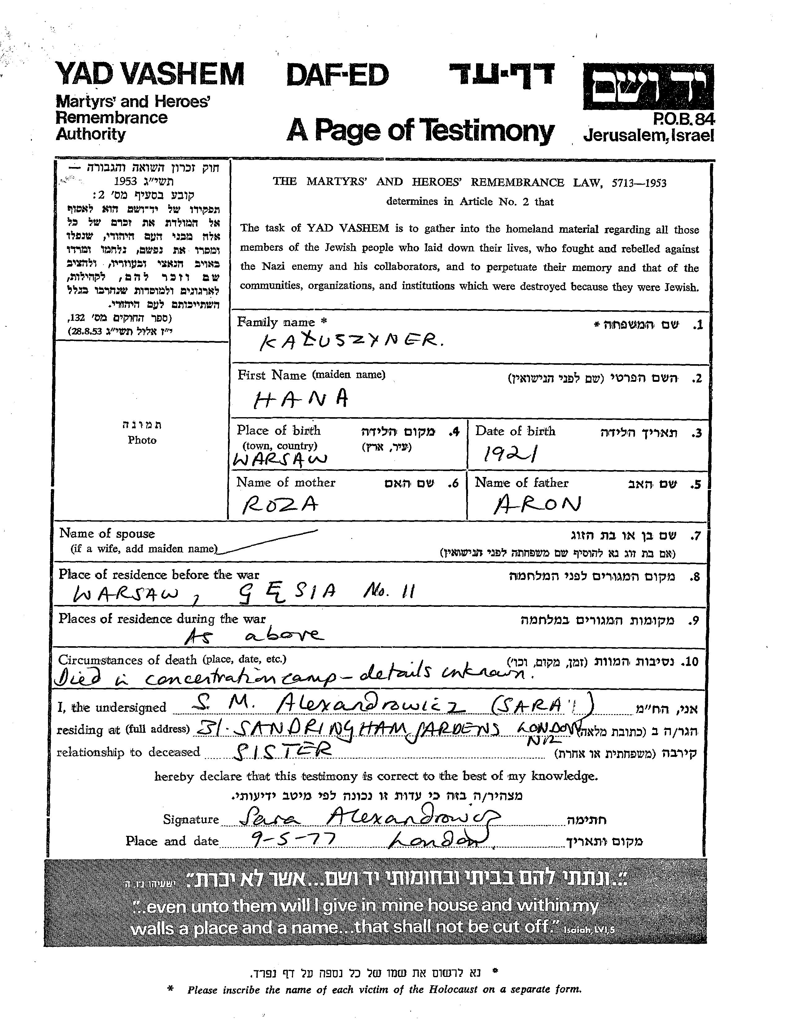 Ana Khana Kaluszyner wurde im Jahr 1921 in Warszawa, Polen geboren. Vor dem Zweiten Weltkrieg lebte sie in Warszawa, Polen.