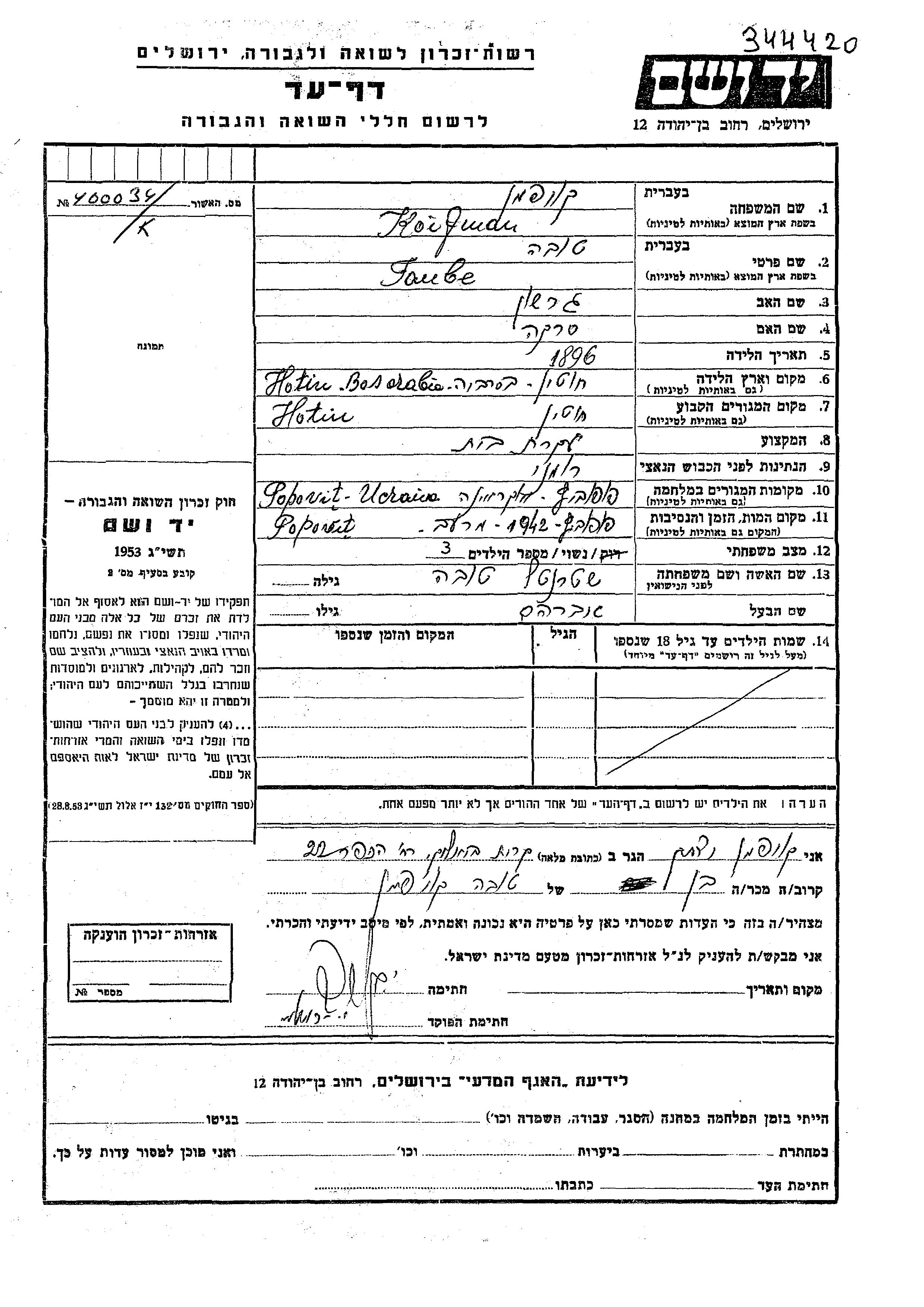 Tauba Tova wurde in der Schoah ermordet. Todesort: Popowicze, Polen im Jahr 1942.