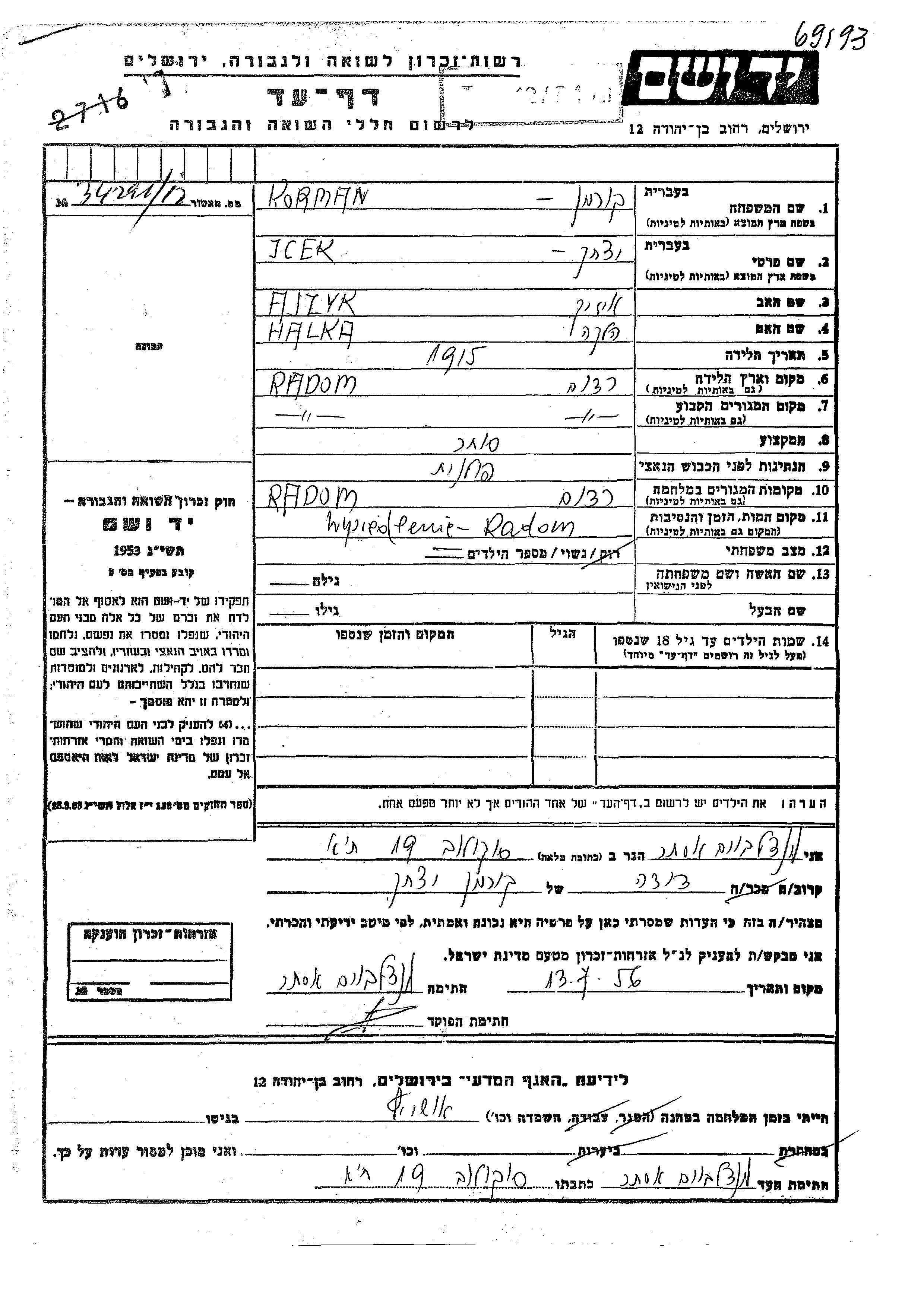 Yitzkhak Korman wurde im Jahr 1915 in Radom, Polen geboren. Er war Kaufmann/-frau. Vor dem Zweiten Weltkrieg lebte er in Radom, Polen.