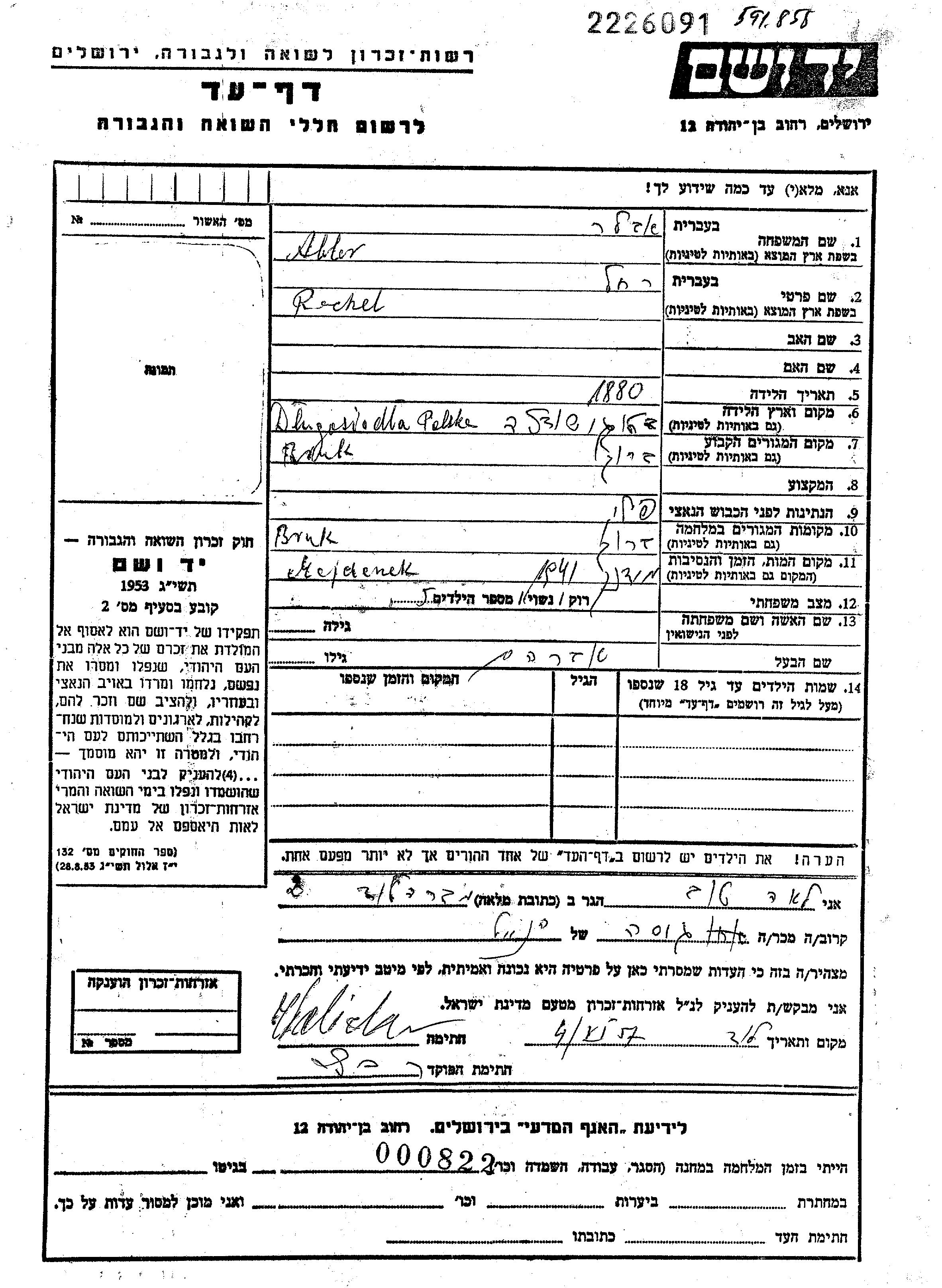 Rachel Abler wurde im Jahr 1880 in Dlugosiodlo, Polen geboren. Sie war mit Abram Verheiratet. Vor dem Zweiten Weltkrieg lebte sie in Brok, Polen. Während des Krieges war sie in Brok, Polen.