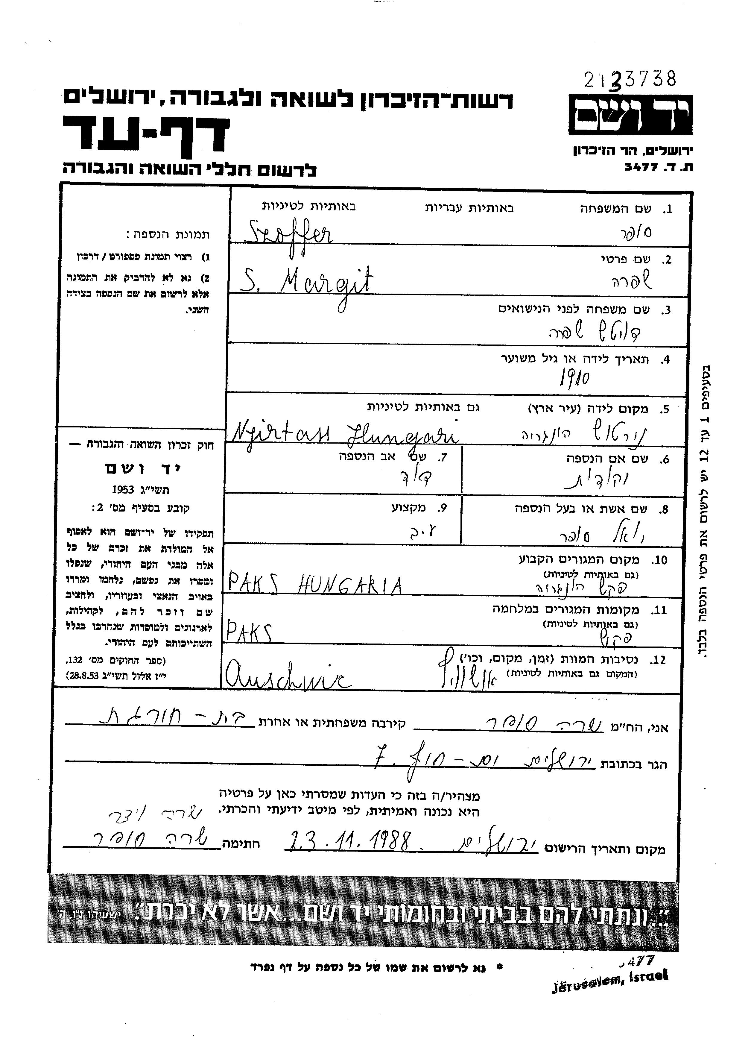 Margit Shifra Szoffer, geb. Deutsch wurde in Nyirtass, Ungarn geboren. Sie war Hausfrau. Vor dem Zweiten Weltkrieg lebte sie in Paks, Ungarn.