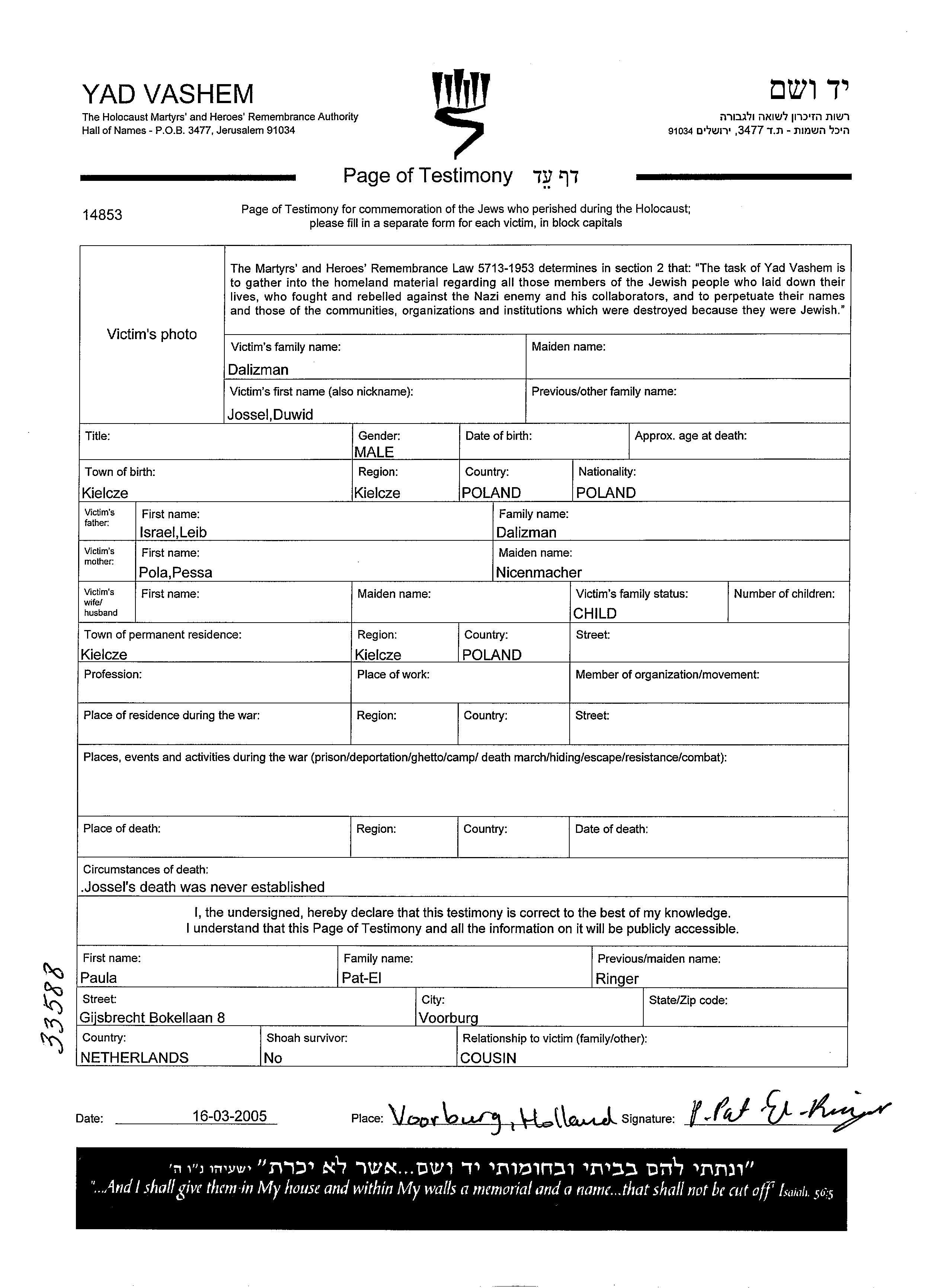 Jossel Duwid Dalizman wurde in Kielce, Polen geboren. Vor dem Zweiten Weltkrieg lebte er in Kielce, Polen.