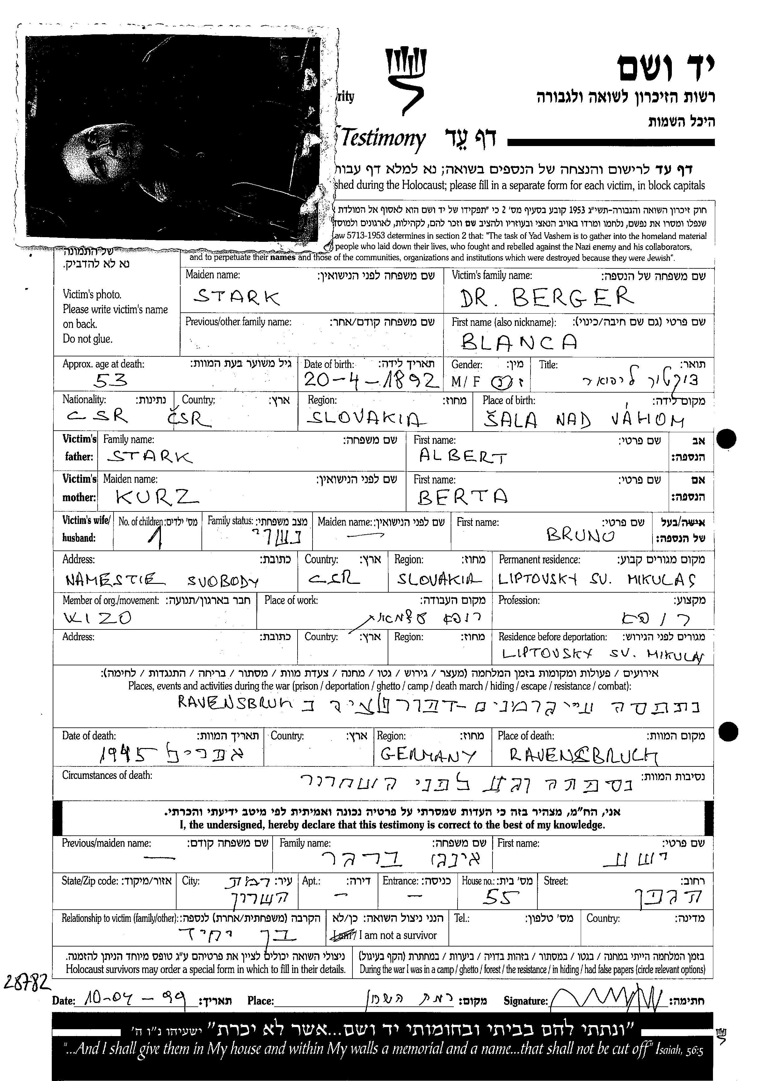 Blanca Berger, geb. Stark wurde im Jahr 1889 in Sala, Tschechoslowakei geboren. Sie war Arzt/ärztin. Vor dem Zweiten Weltkrieg lebte sie in Liptovsky Svaty Mikulas, Tschechoslowakei. Blanca wurde in der Schoah ermordet. Todesort: Ravensbrück, Deutsches Reich im Jahr 1945.