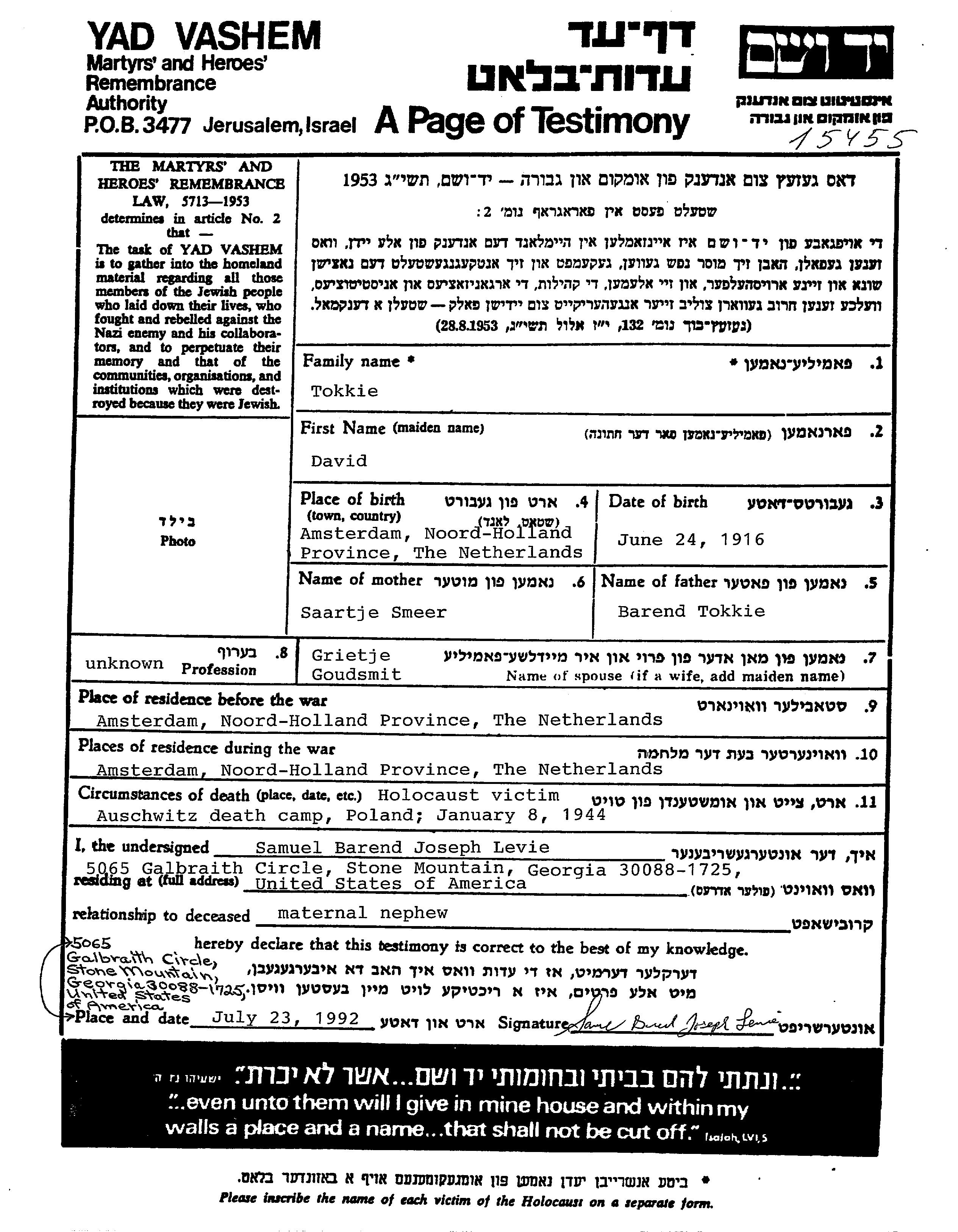 Tokkie David 1916 Amsterdam, Niederlande Liste von ermordeten Juden aus Holland