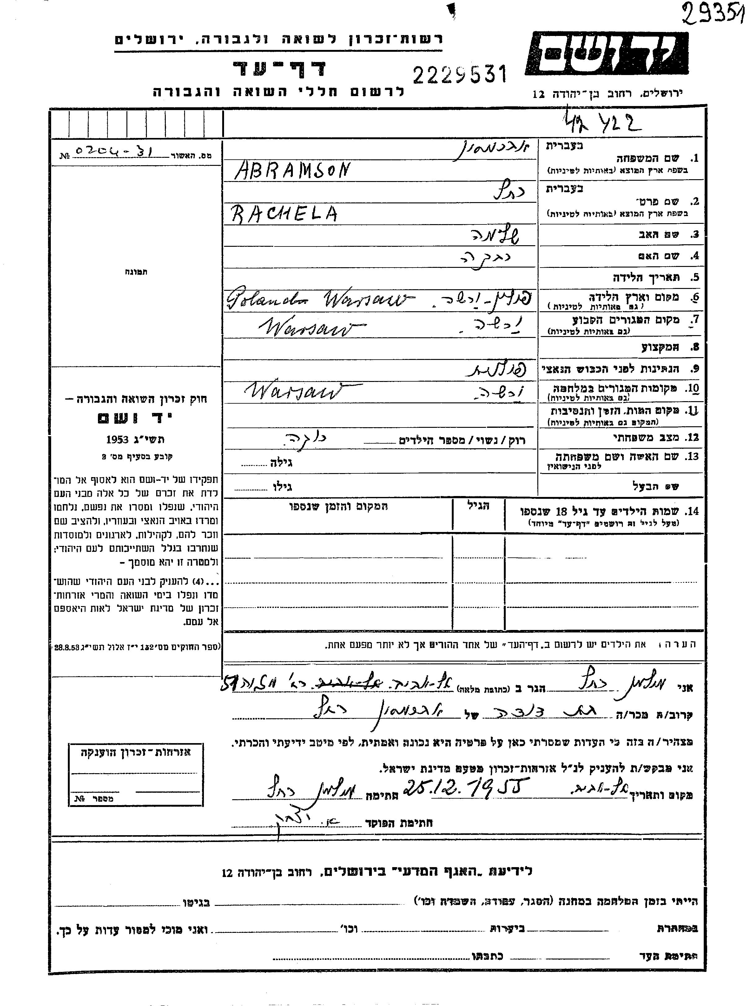 Abramson Rachela Warszawa, Polen Gedenkblatt