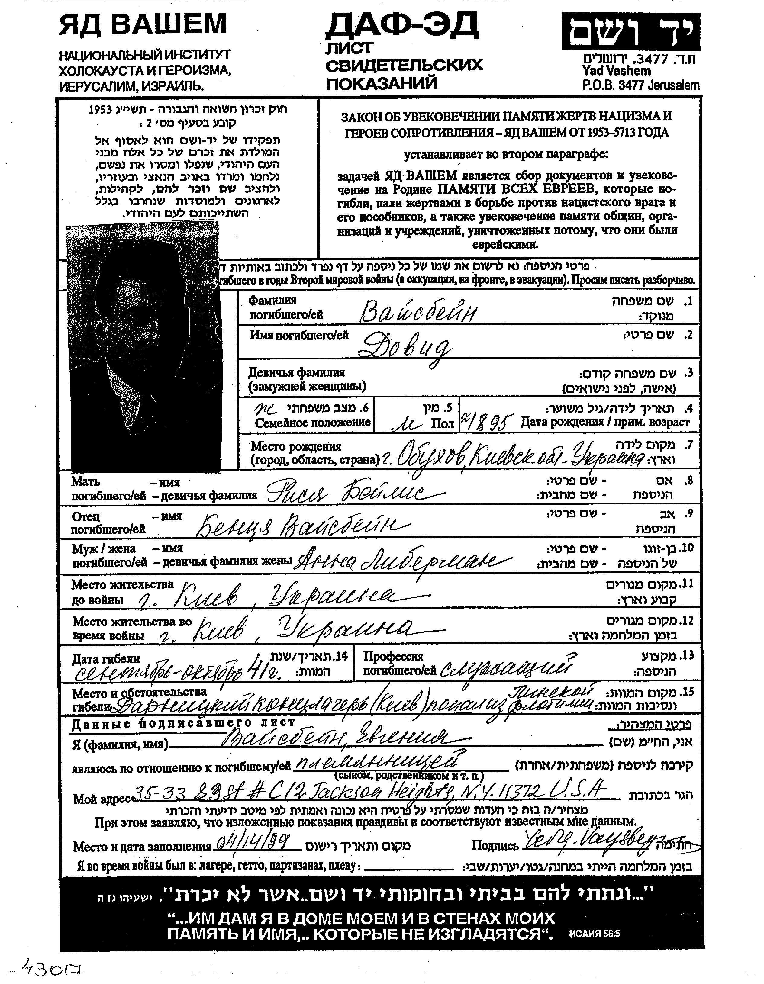 David Vaisbein wurde im Jahr 1895 in Obukhov, Ukraine (UdSSR) geboren. Vor dem Zweiten Weltkrieg lebte er in Kiev, Ukraine (UdSSR).