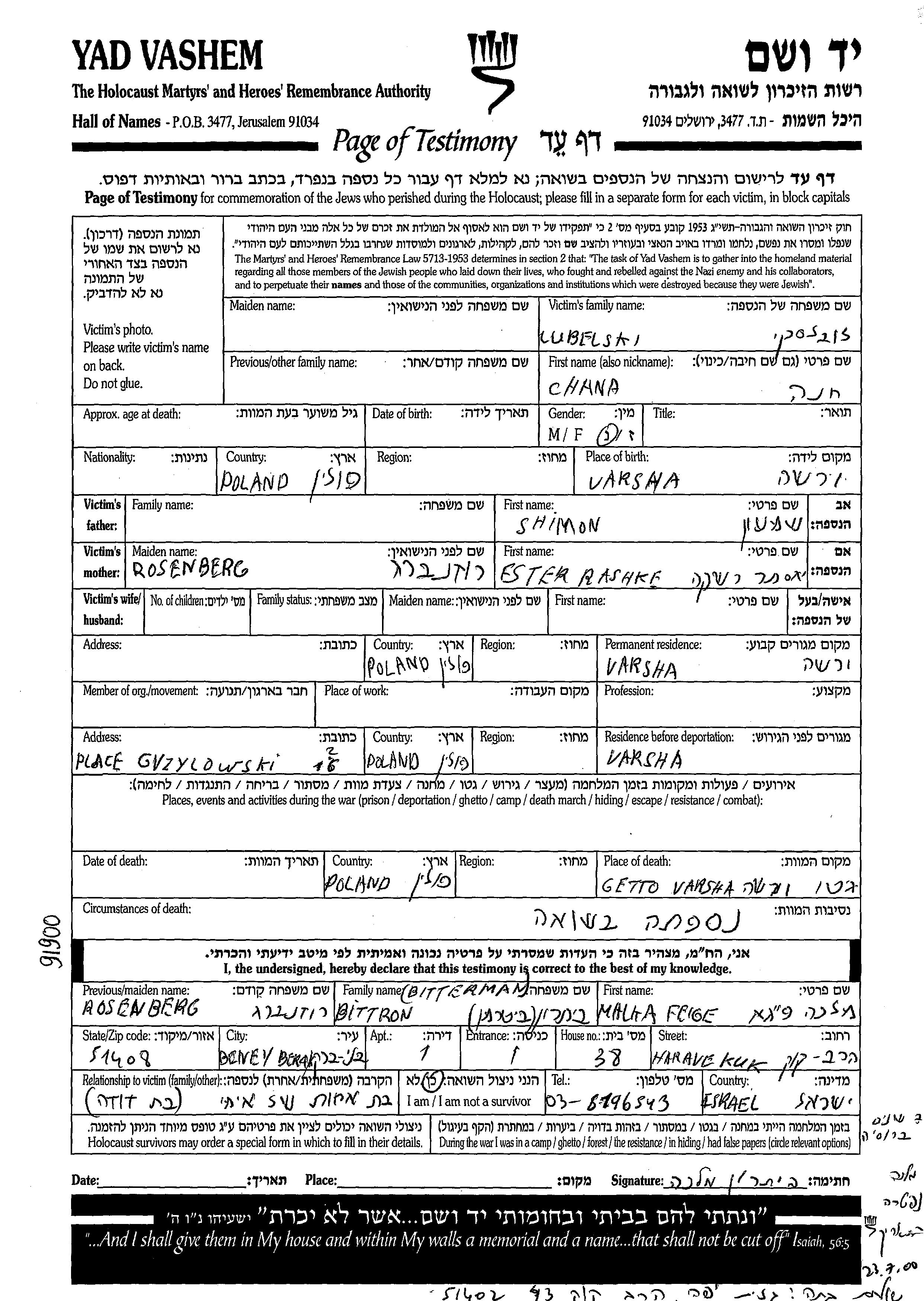 Khana Name unbekannt Lubelski, geb. Lubelski wurde im Jahr 1904 in Warsaw, Polen geboren. Vor dem Zweiten Weltkrieg lebte sie in Warsaw, Polen.