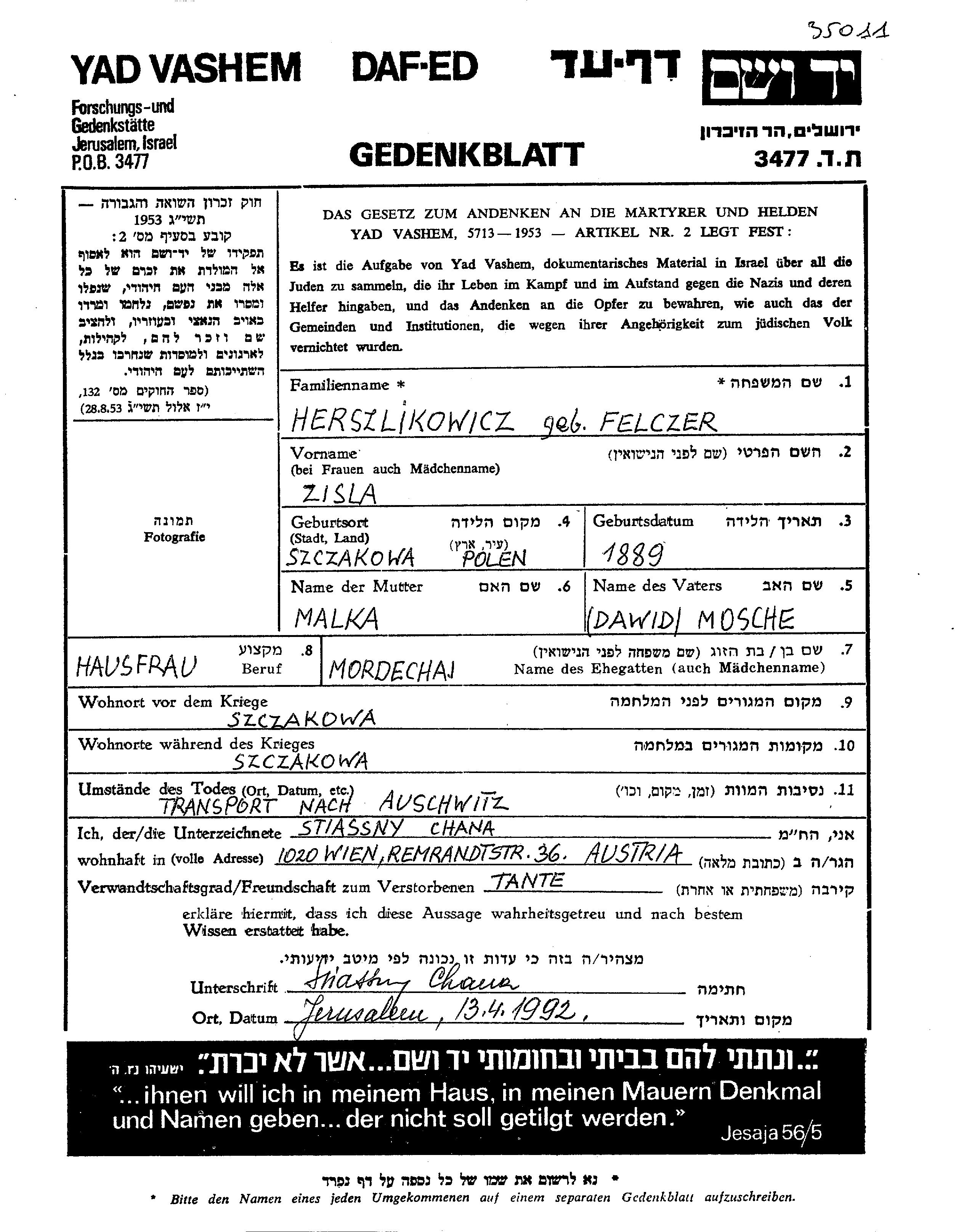 Herszlikowicz Zisla 1889 Szczakowa, Polen Gedenkblatt
