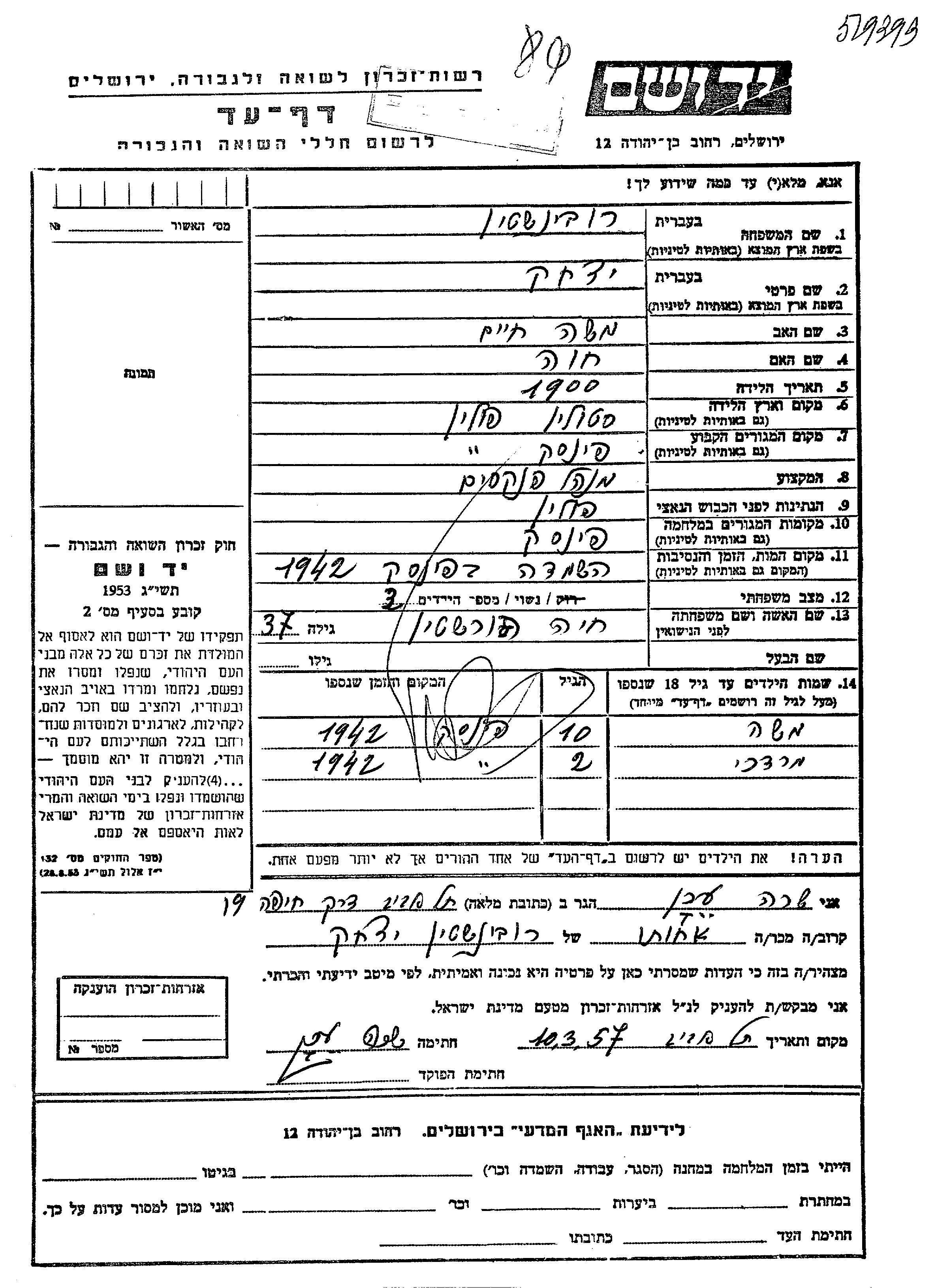 Yitzkhak wurde in der Schoah ermordet. Todesort: Pinsk, Polen im Jahr 1942.