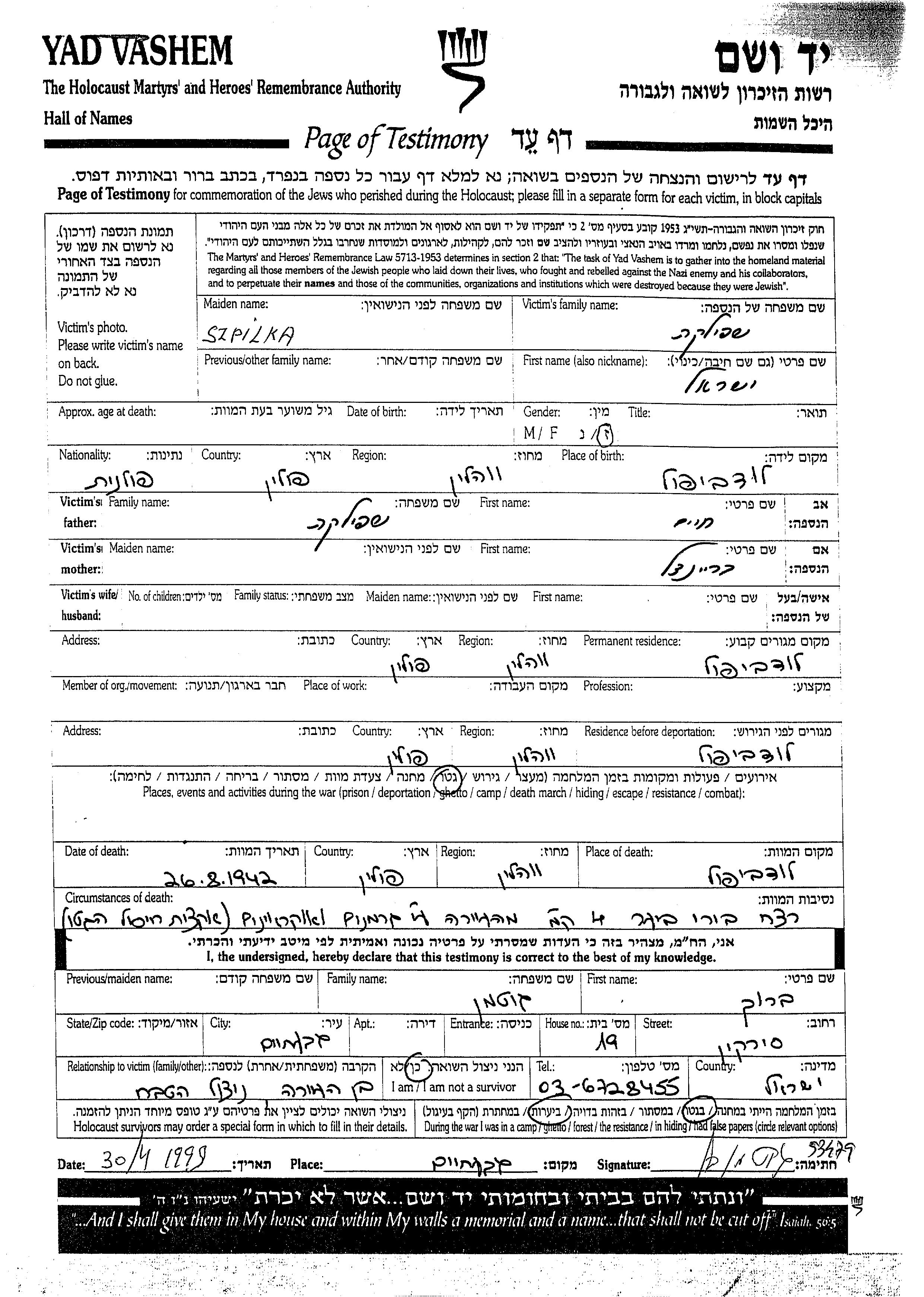 Yisrael wurde in der Schoah ermordet. Todesort: unbekannt im Jahr 1942.