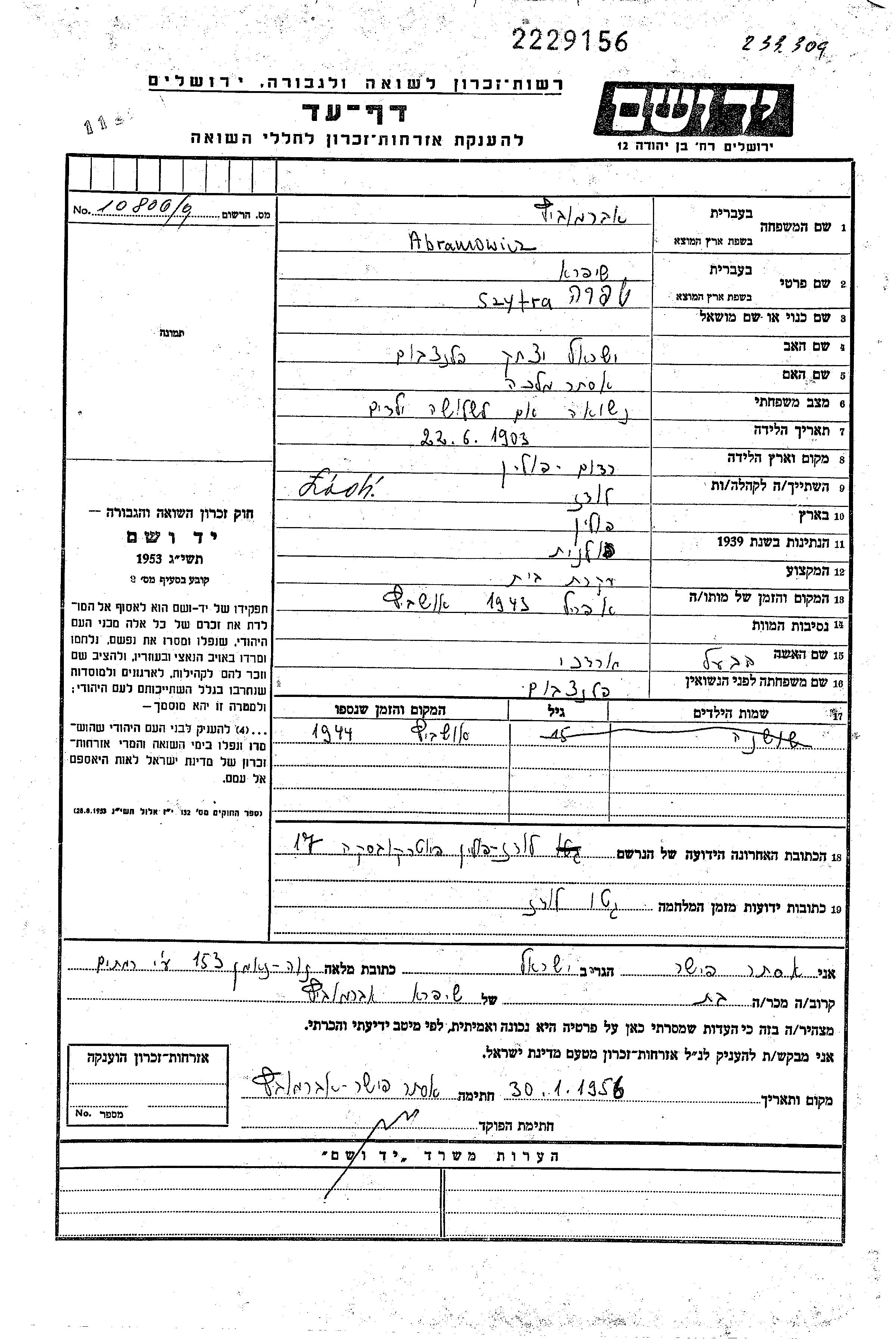 Shifra Abramowicz, geb. Flancbam wurde im Jahr 1902 in Radom, Polen geboren. Sie war Hausfrau. Vor dem Zweiten Weltkrieg lebte sie in Lodz, Polen.
