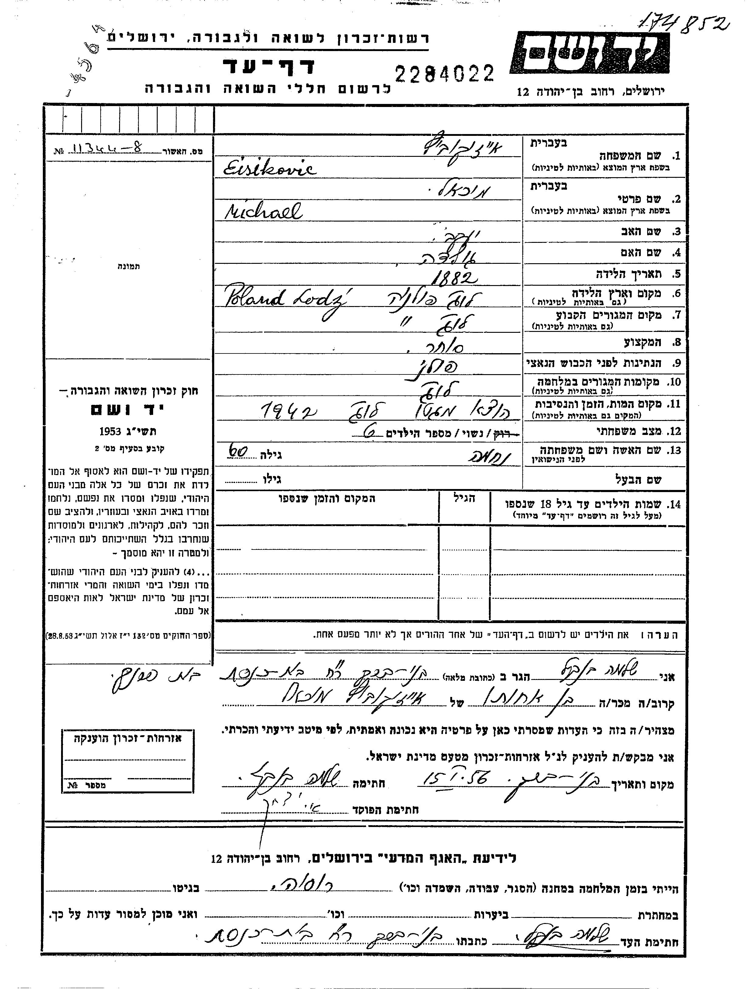 Mikhael wurde in der Schoah ermordet. Todesort: Lodz, Polen.