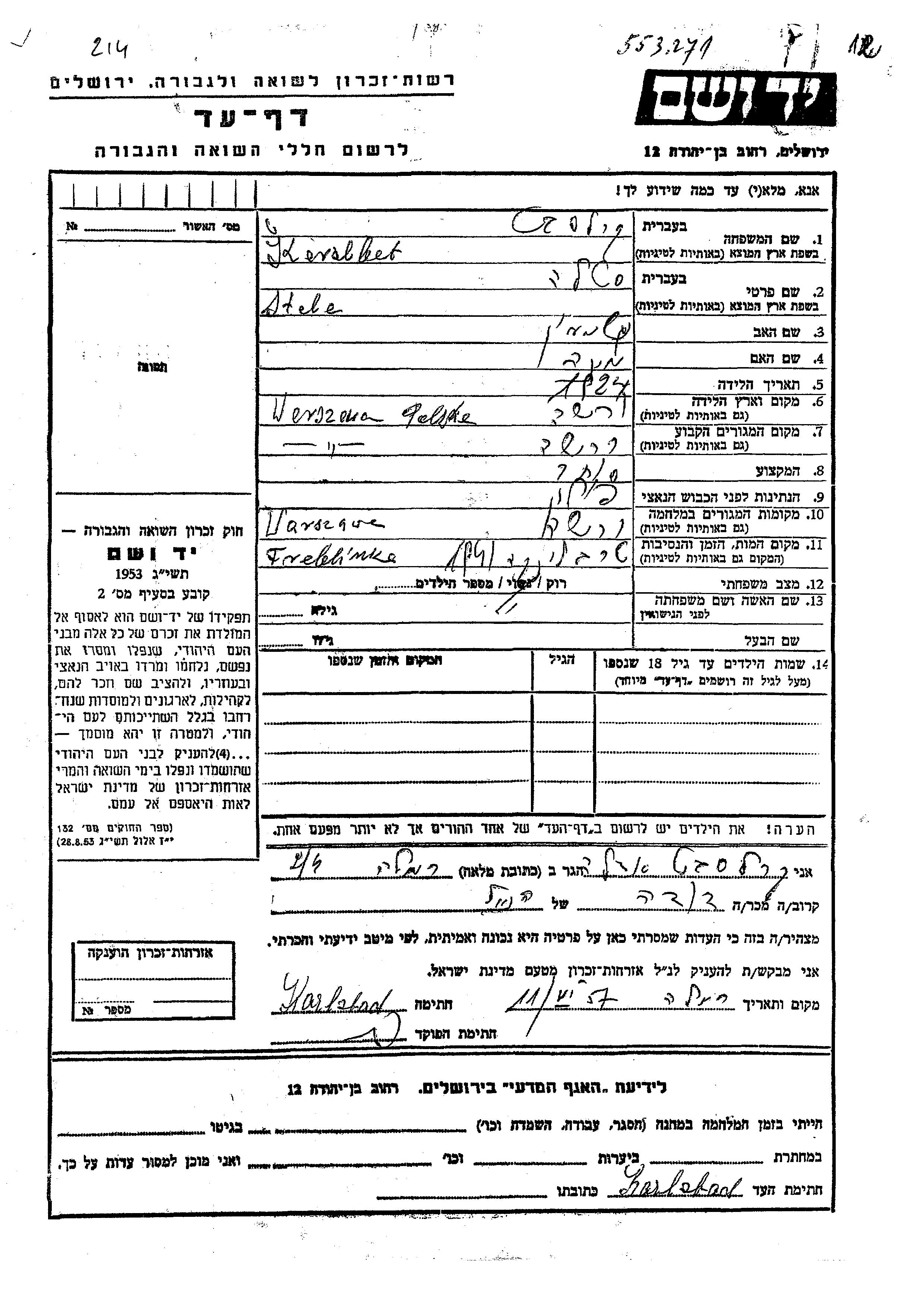 Stela Kerslbet wurde im Jahr 1924 in Warsaw, Polen geboren. Sie war Kaufmann/-frau. Vor dem Zweiten Weltkrieg lebte sie in Warsaw, Polen.