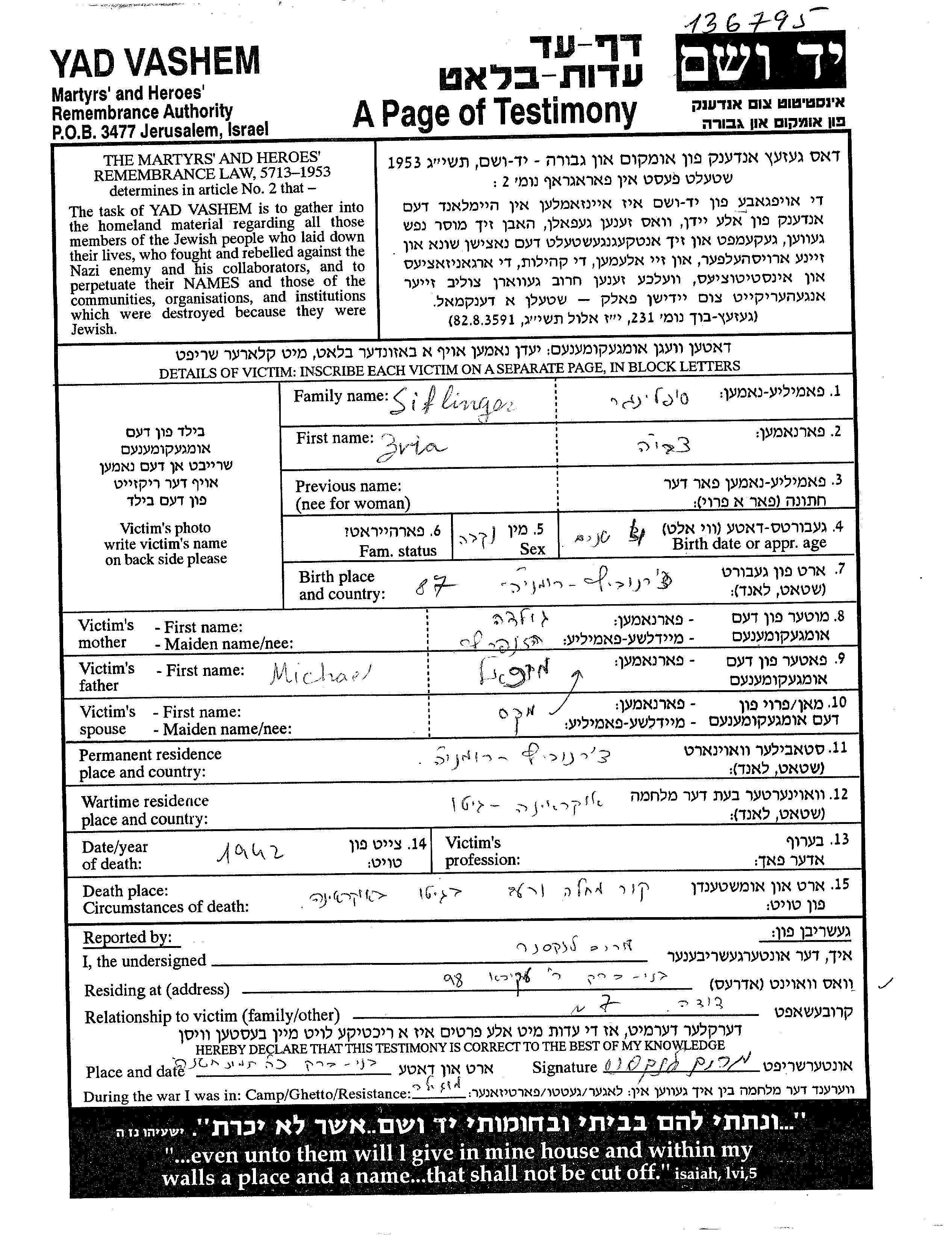 Tzvia Siflinger wurde im Jahr 1938 in Czernowitz, Rumänien geboren. Vor dem Zweiten Weltkrieg lebte sie in Czernowitz, Rumänien.