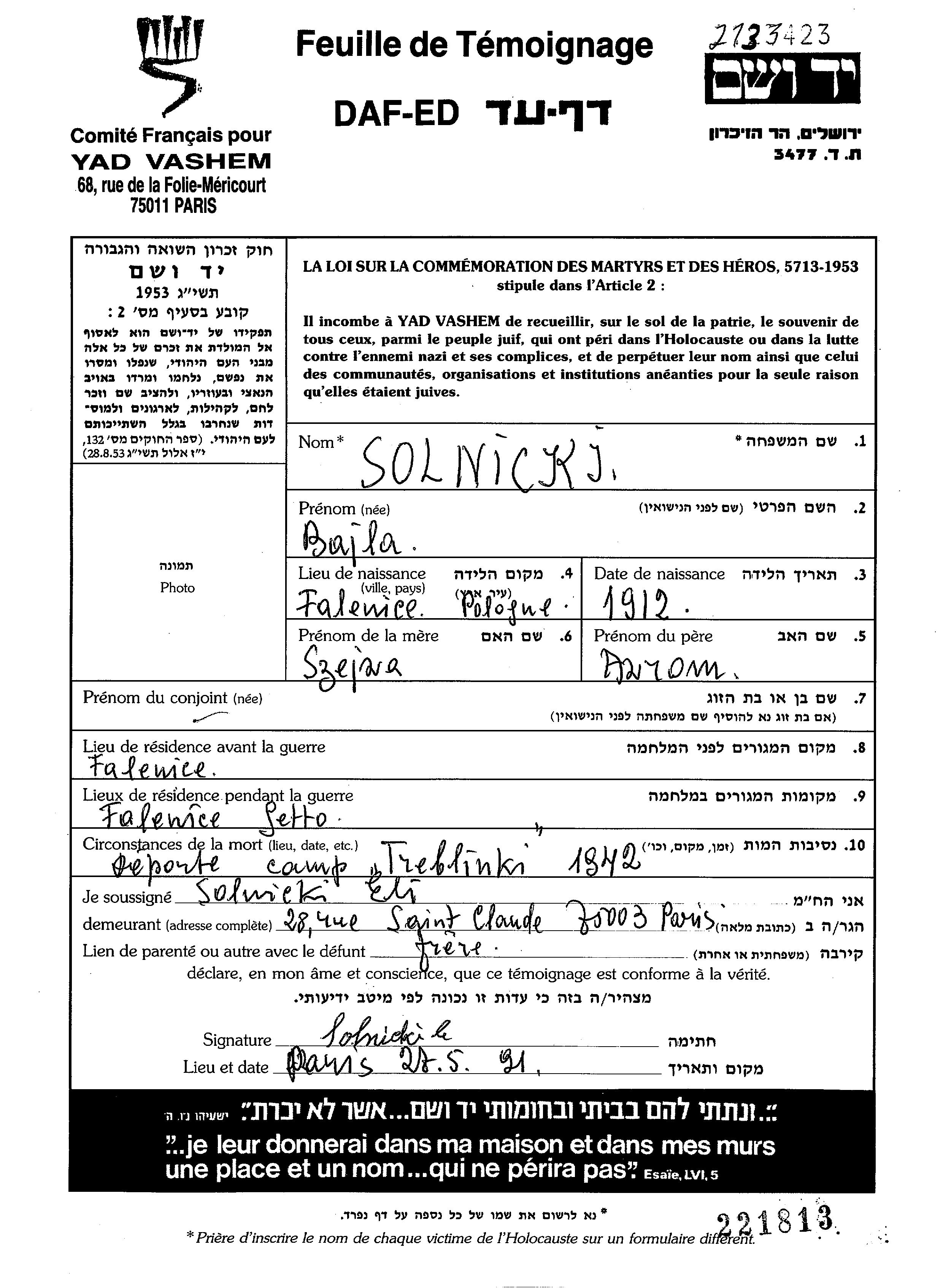 Bajla Solnicki wurde im Jahr 1912 in Falenica, Polen geboren. Vor dem Zweiten Weltkrieg lebte sie in Falenica, Polen.