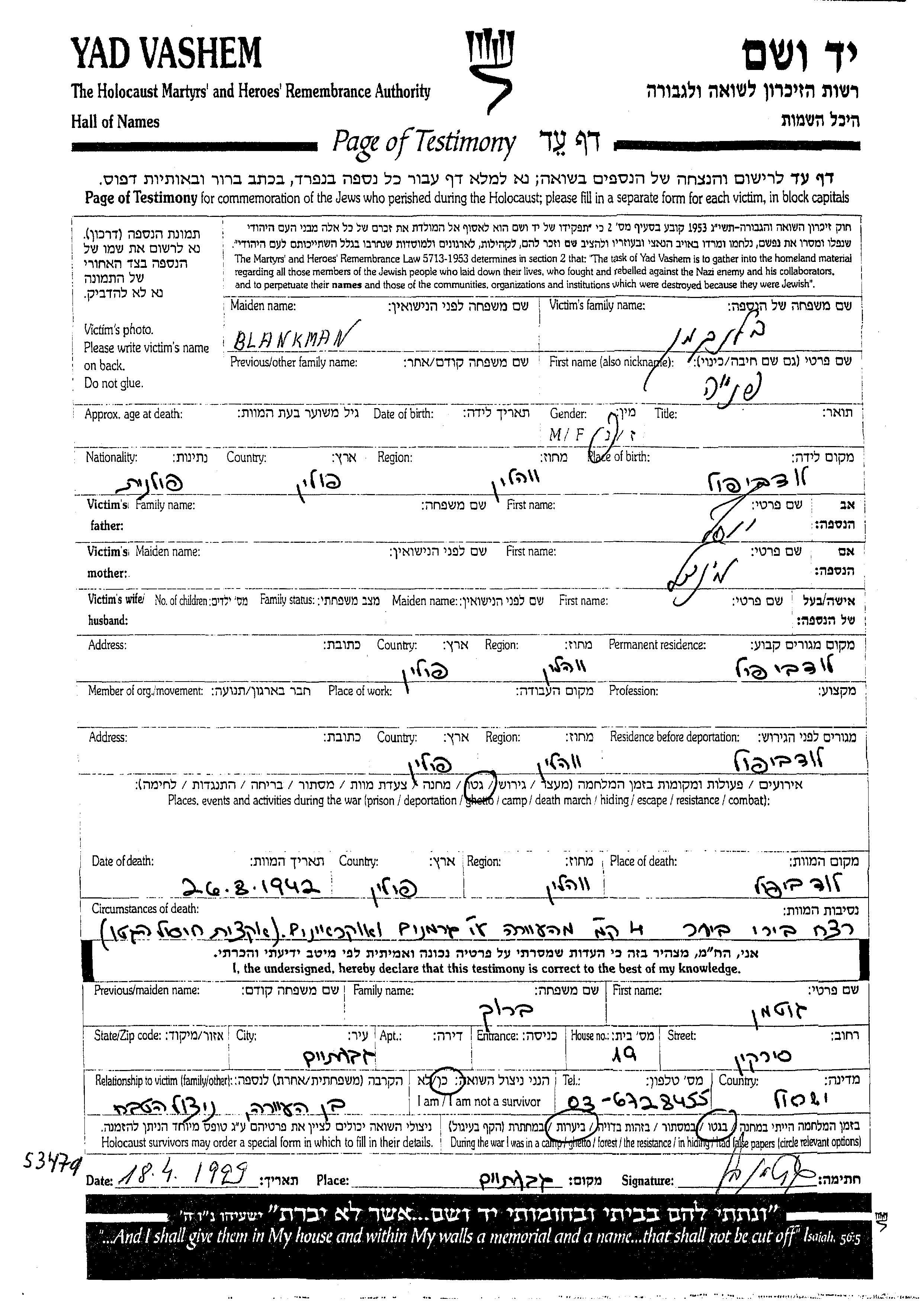 Blankman Fania Tzipora Ludwipol, Polen Gedenkblatt