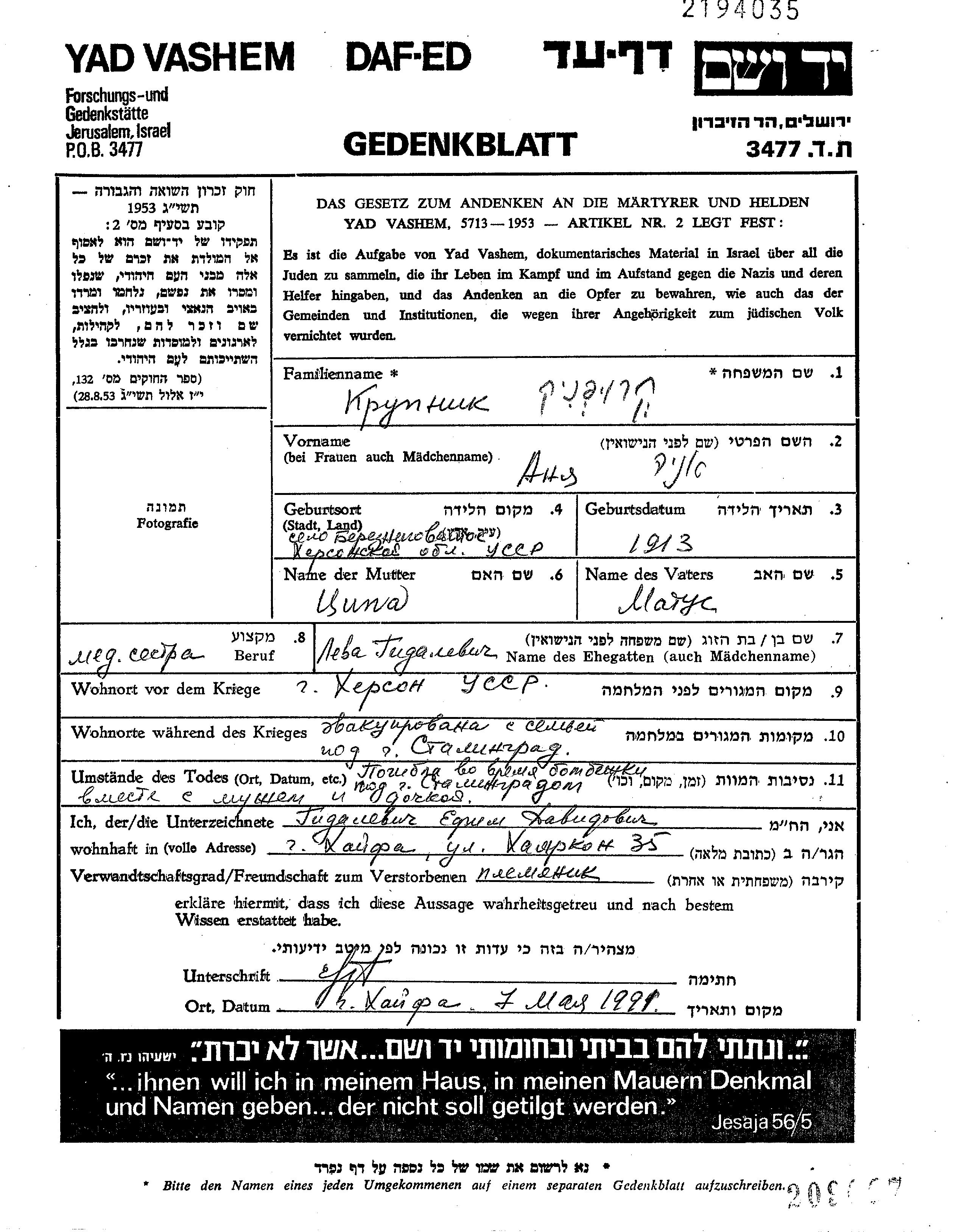 Krupnik Ania 1916 Kherson, Ukraine (UdSSR) Gedenkblatt