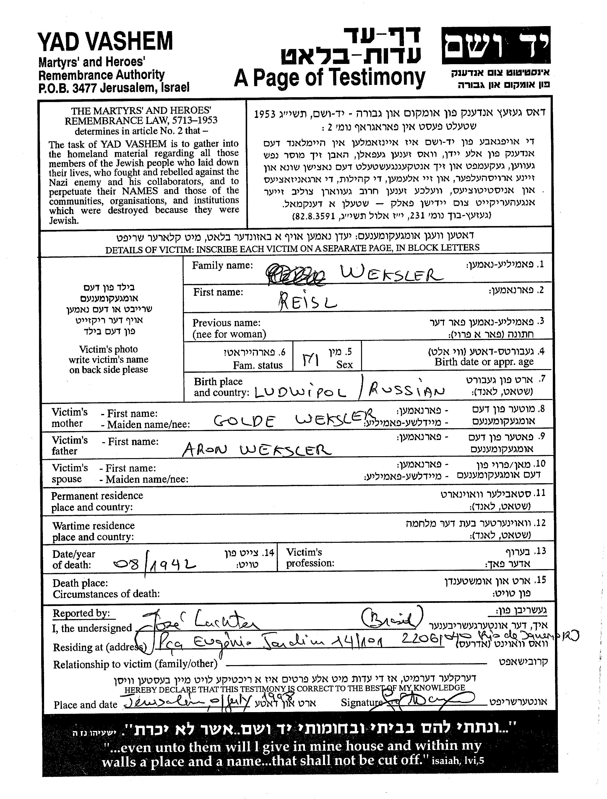 Rejzl Weksler wurde im Jahr 1916 in Ludwipol, Polen geboren. Vor dem Zweiten Weltkrieg lebte sie in Ludwipol, Polen.