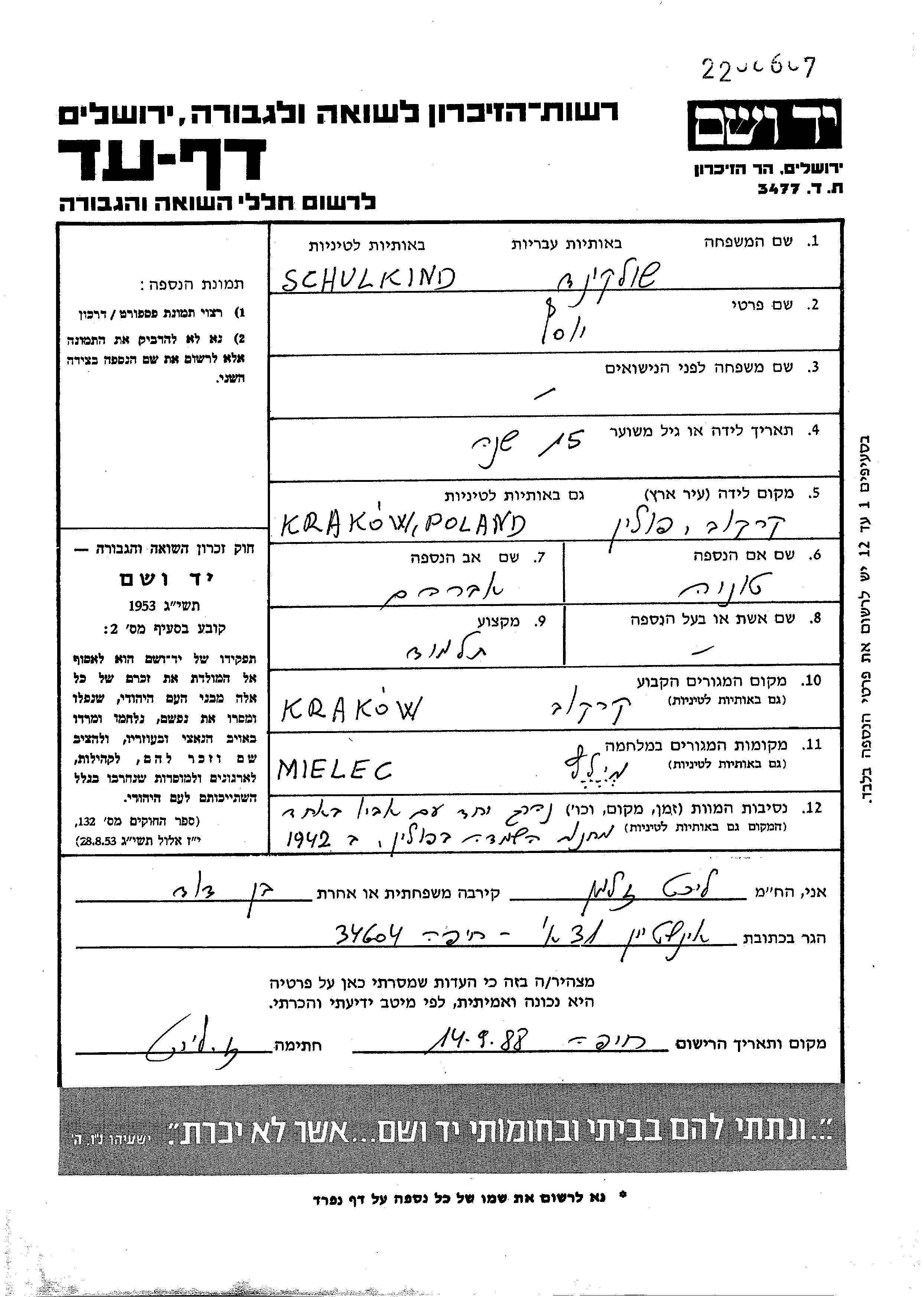 Yosef Szulkind wurde im Jahr 1924 in Krakow, Polen geboren. Er war Schüler/-in. Vor dem Zweiten Weltkrieg lebte er in Krakow, Polen.
