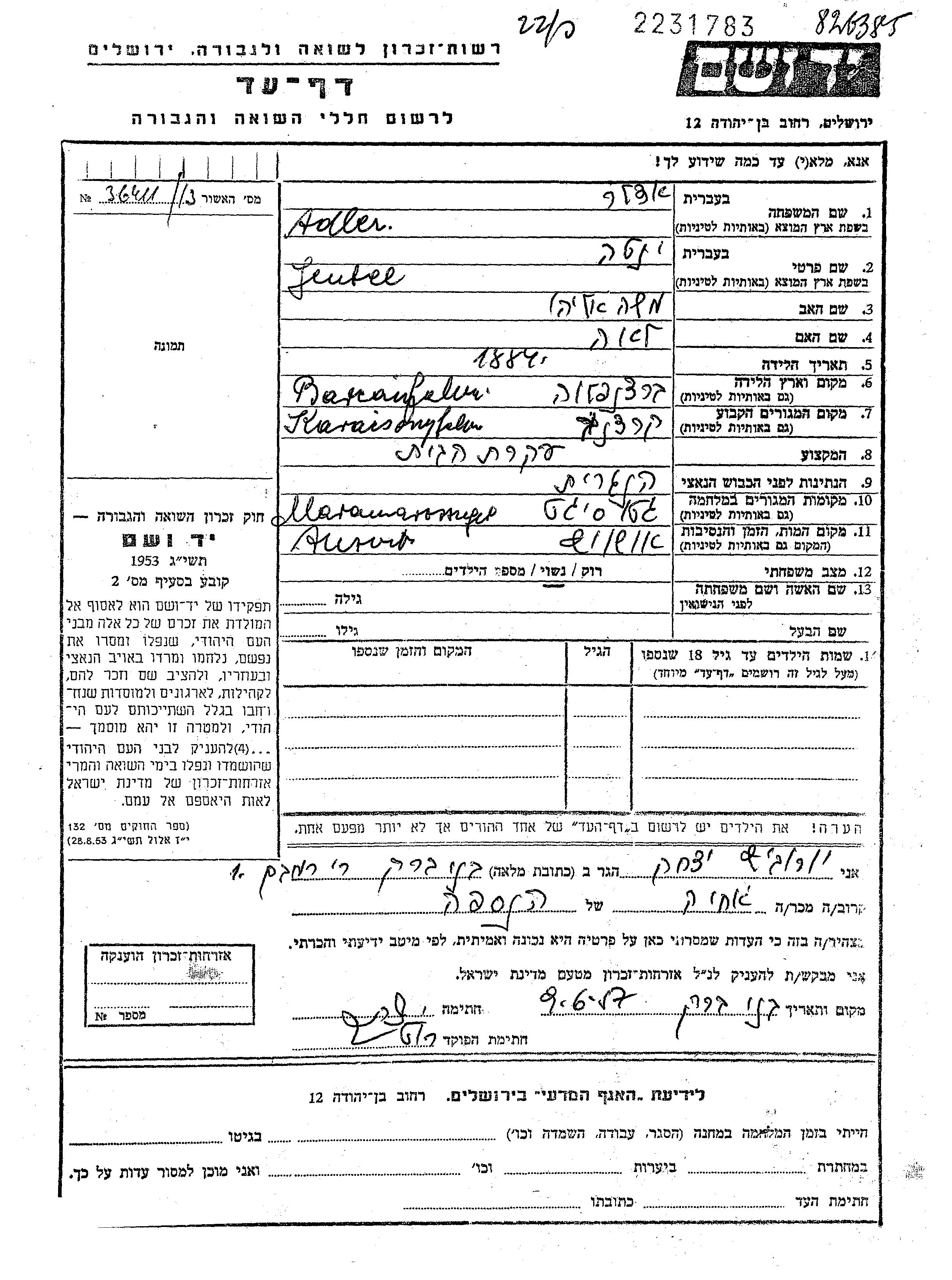 Jentee Yenta Adler wurde im Jahr 1884 in Boerfalva, Rumänien geboren. Sie war die Tochter von Moshe Eliahu und Lea. Sie war Hausfrau und Verheiratet. Vor dem Zweiten Weltkrieg lebte sie in Karaczonfalva, Rumänien. Während des Krieges war sie in Maramarossziget, Rumänien.