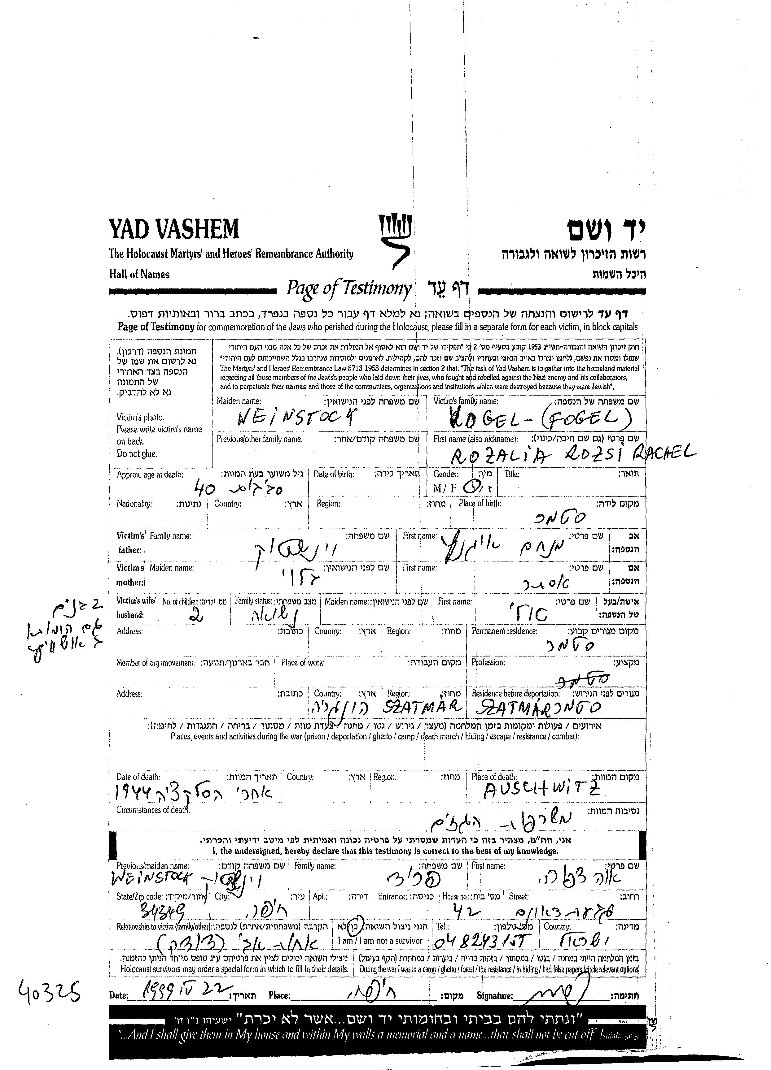 Fogel | Rachel | 1908 | Satmer, Rumänien | Gedenkblatt |