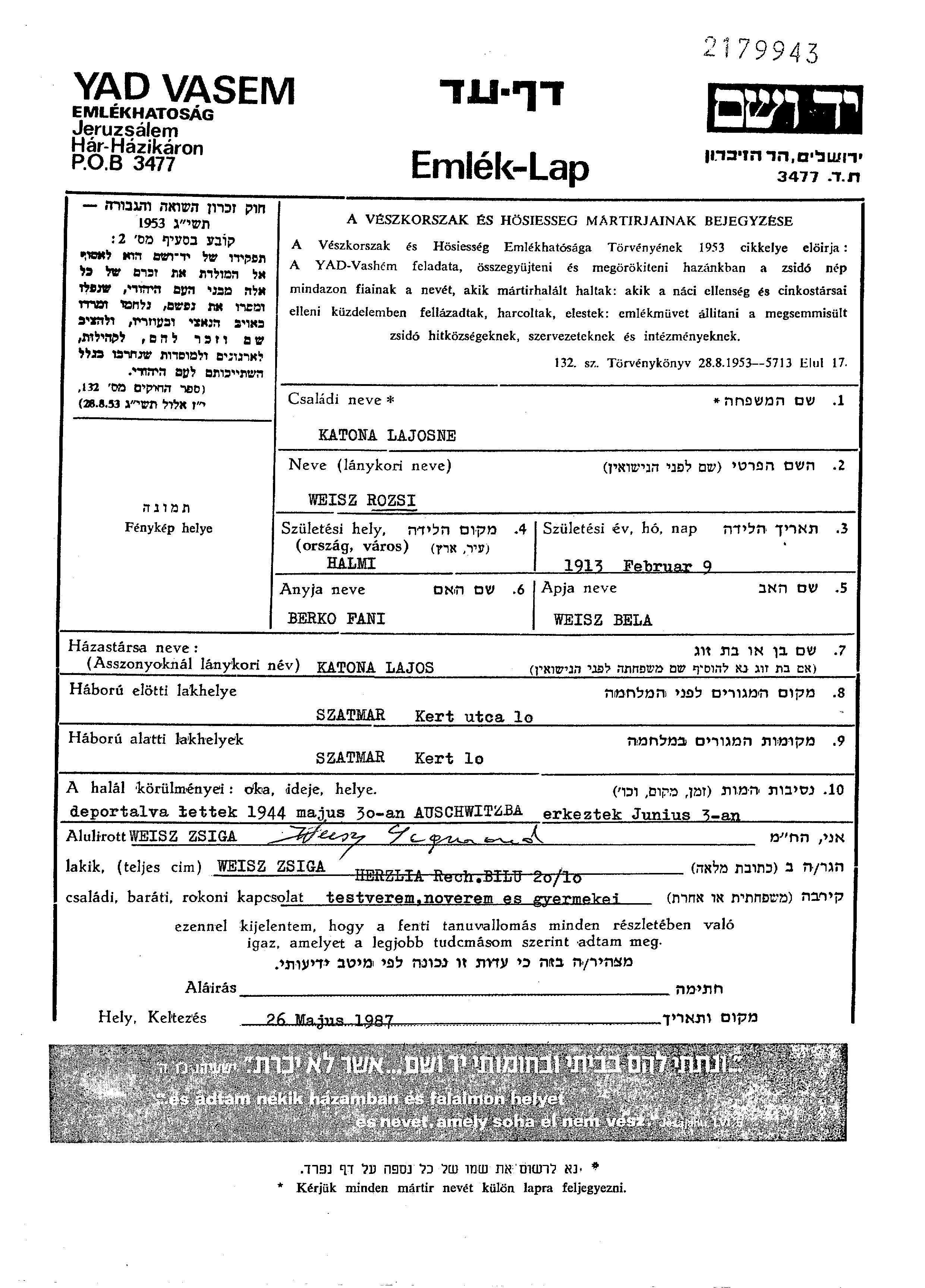 Rozsi Katona, geb. Weisz wurde im Jahr 1910 in Halmi, Rumänien geboren. Sie war Metzger/-in. Vor dem Zweiten Weltkrieg lebte sie in Satu Mare, Rumänien.