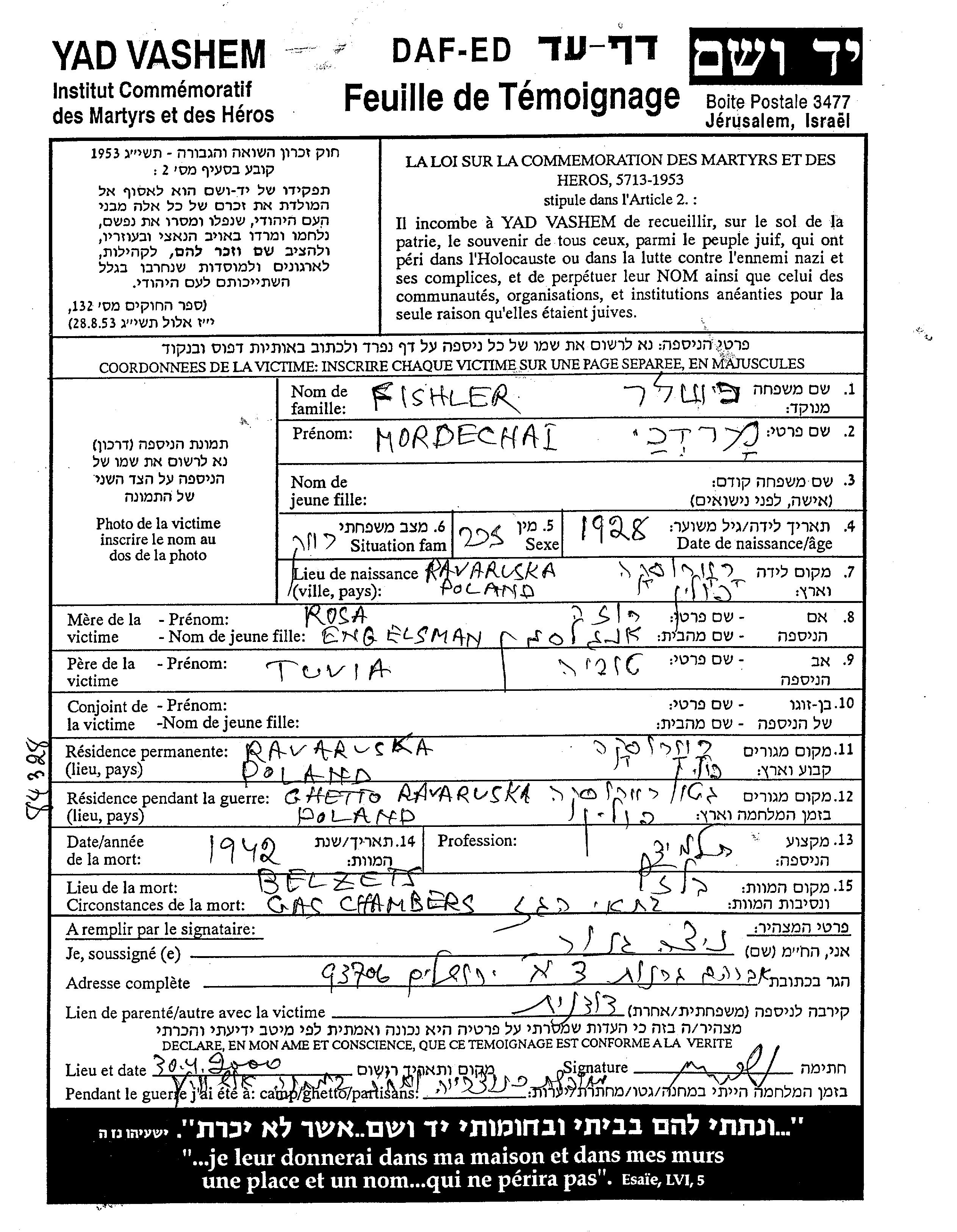 Mordekhai Fischler wurde im Jahr 1928 in Rawa Ruska, Polen geboren. Er war Schüler/-in. Vor dem Zweiten Weltkrieg lebte er in Rawa Ruska, Polen.