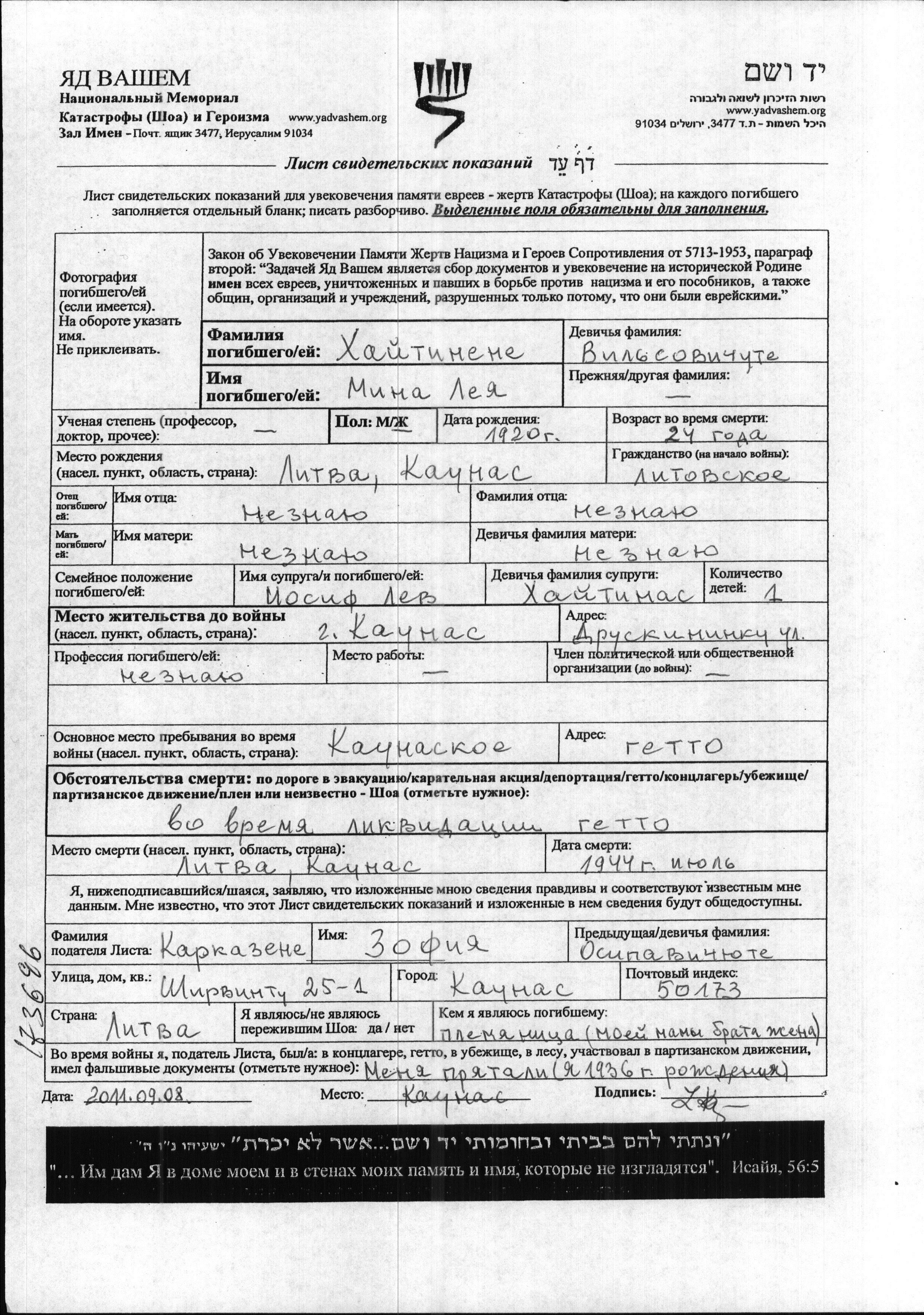 Leya Mina Khaitinene, geb. Vilfovichute Vilsovichute wurde in Kaunas, Litauen geboren. Sie war Krankenpfleger/-in. Vor dem Zweiten Weltkrieg lebte sie in Kaunas, Litauen.