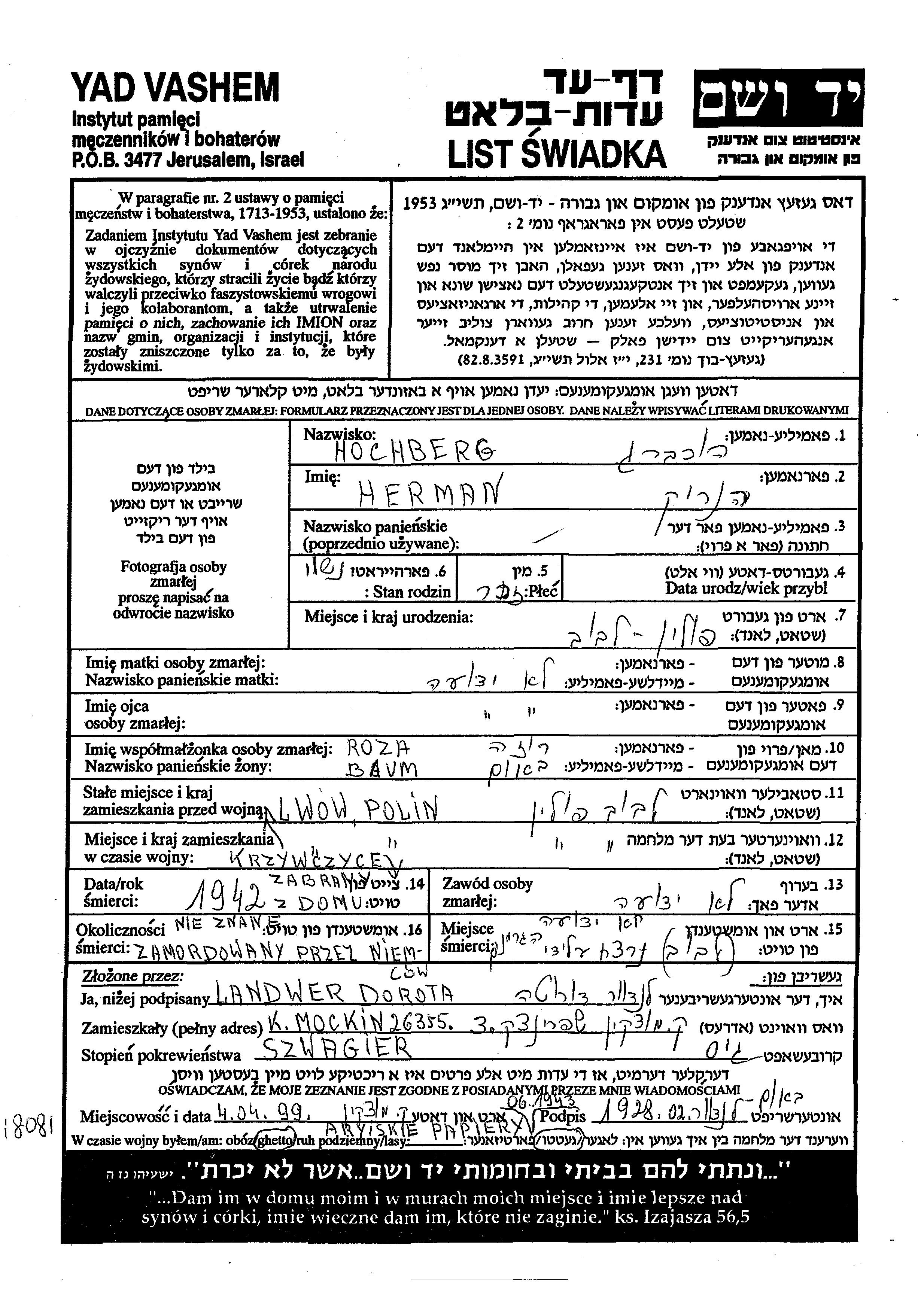 Henrik Herman Hochberg wurde im Jahr 1907 in Lwow, Polen geboren. Er war Kaufmann/-frau. Vor dem Zweiten Weltkrieg lebte er in Lwow, Polen.
