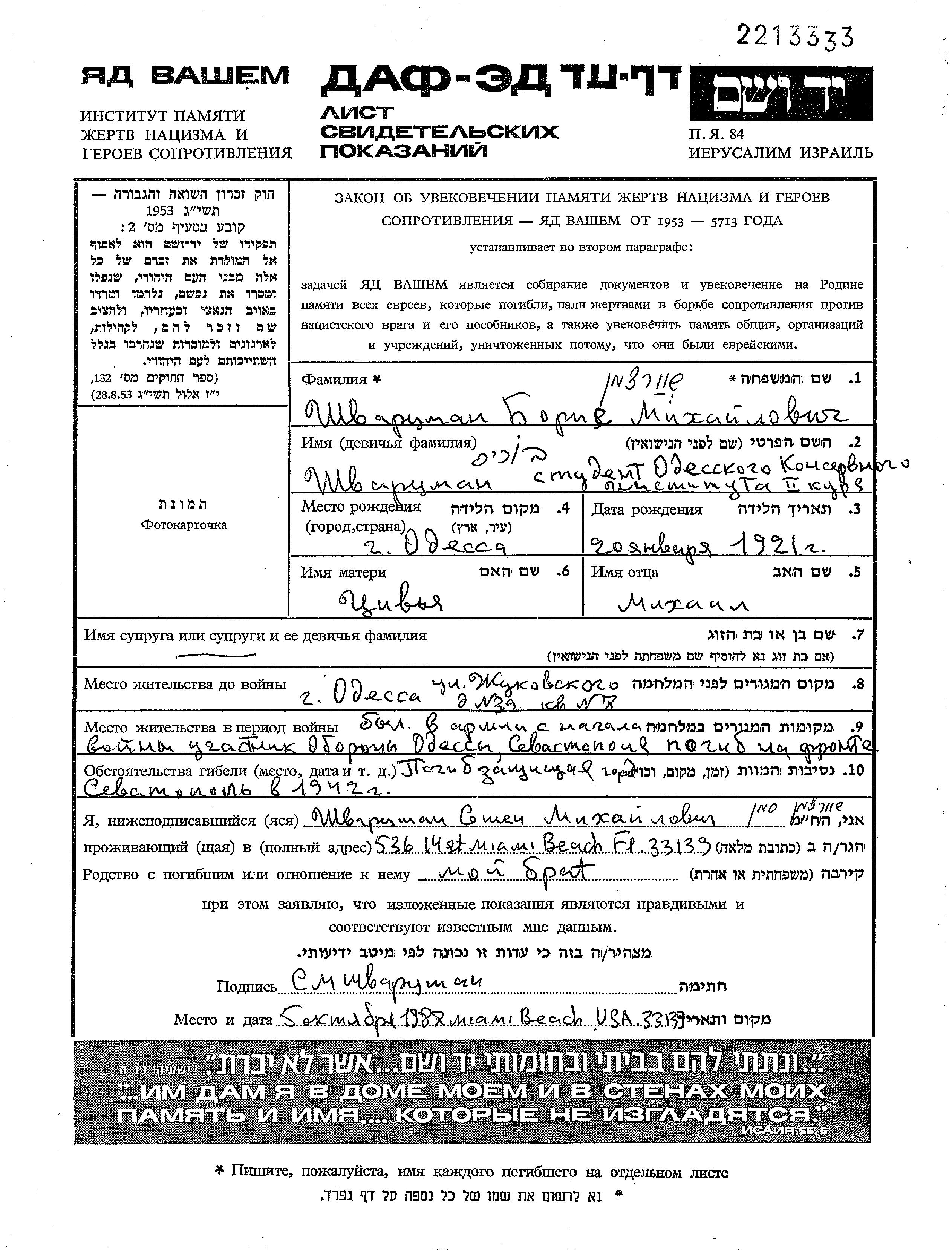 Boris Shvartsman wurde im Jahr 1921 in Odessa, Ukraine (UdSSR) geboren. Er war Student. Vor dem Zweiten Weltkrieg lebte er in Odessa, Ukraine (UdSSR).
