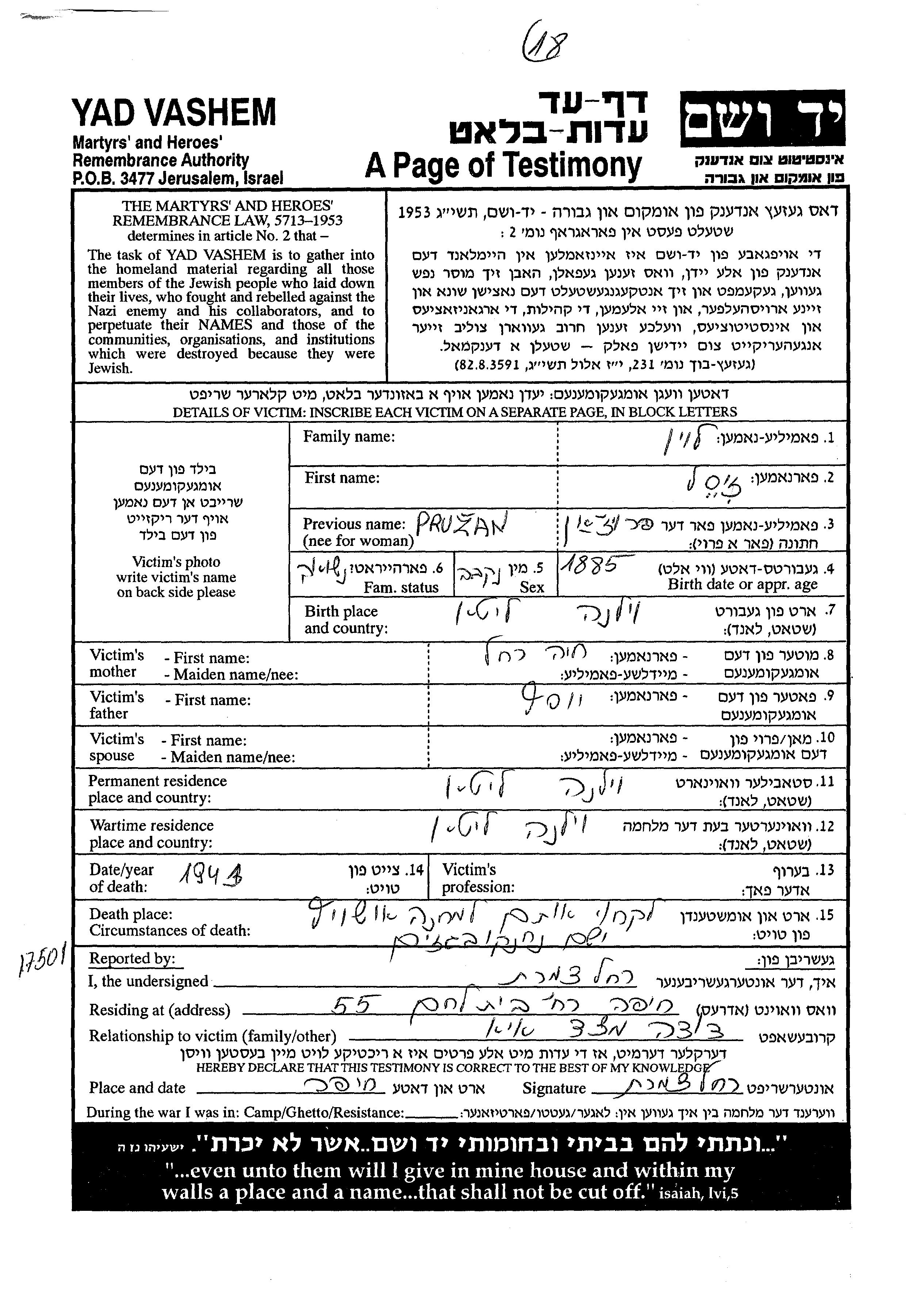 Zisl Lewin, geb. Pruzan wurde im Jahr 1885 in Wilno, Polen geboren. Sie war Ladenbesitzer/-in. Vor dem Zweiten Weltkrieg lebte sie in Wilno, Polen.