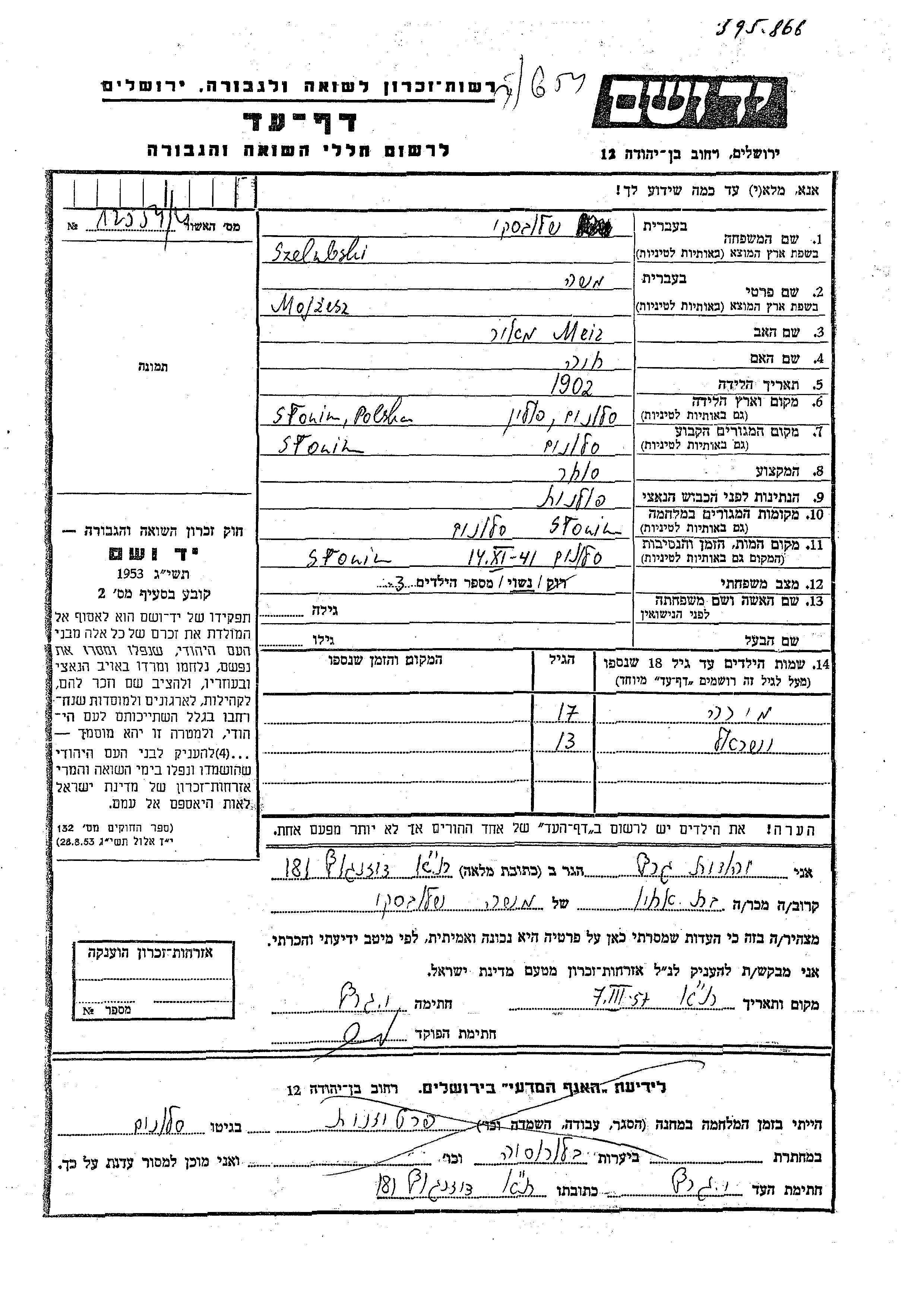 Moshe Szelubski wurde in Slonim, Polen geboren. Er war Kaufmann/-frau. Vor dem Zweiten Weltkrieg lebte er in Slonim, Polen.