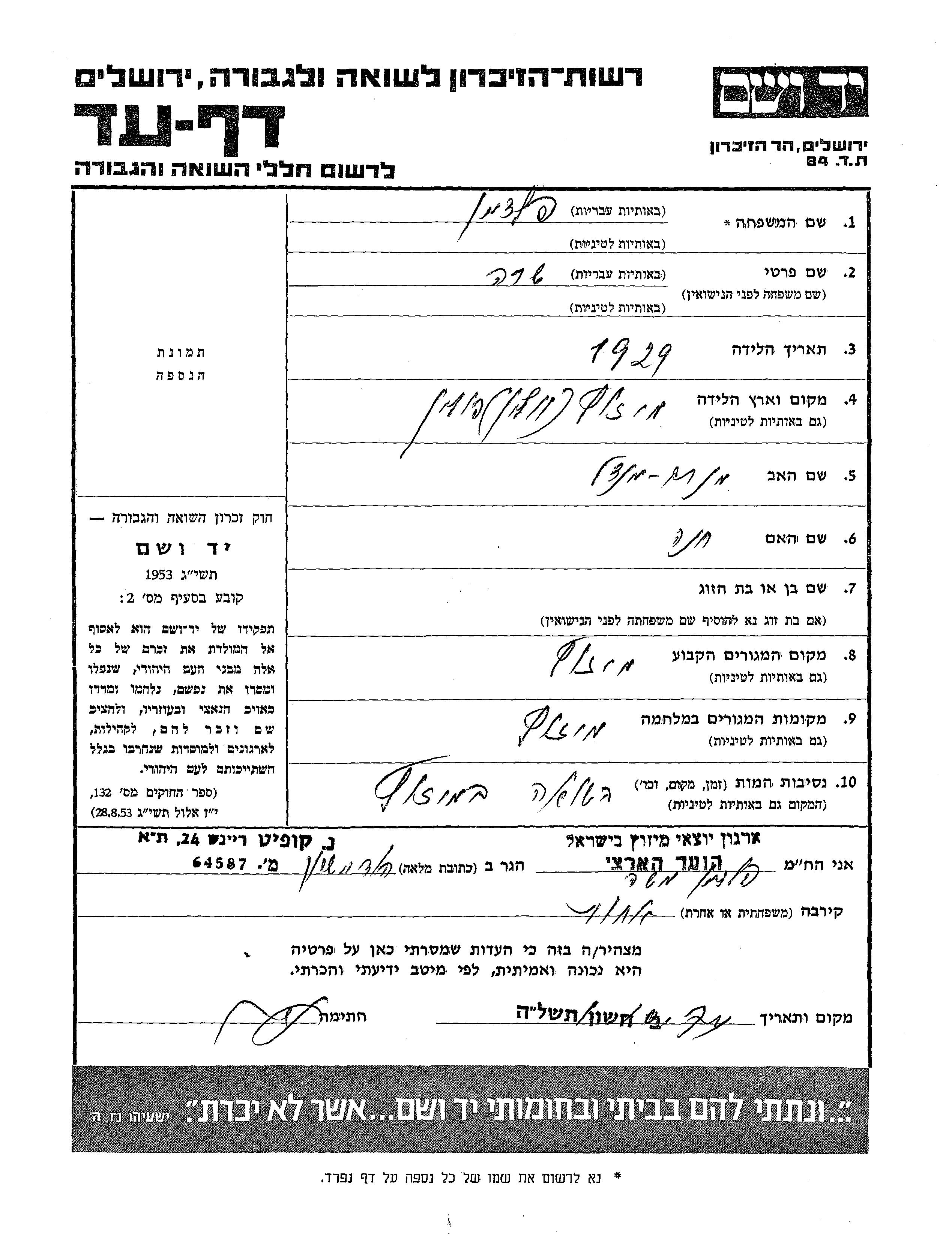 Feldman Sara 1929 Mizocz, Polen Gedenkblatt