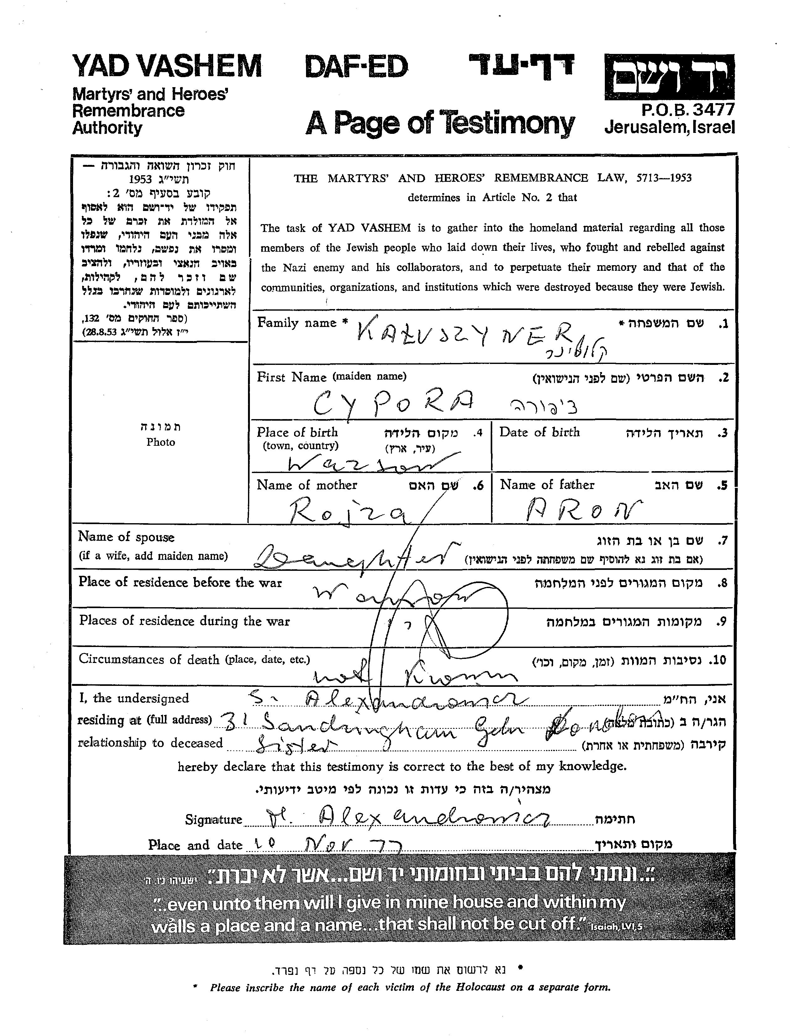 Cypora Kaluszyner wurde im Jahr 1923 in Warsaw, Polen geboren. Vor dem Zweiten Weltkrieg lebte sie in Warsaw, Polen.