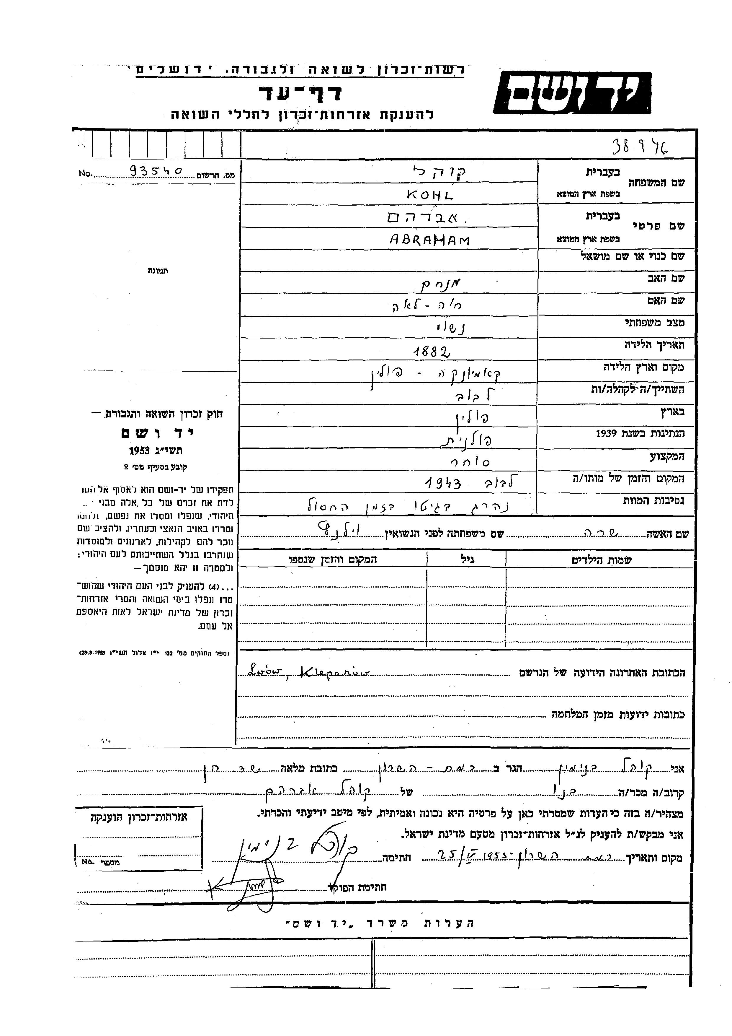 Avraham Kohl Kul wurde im Jahr 1880 in Kamionka, Polen geboren. Er war Kaufmann/-frau. Vor dem Zweiten Weltkrieg lebte er in Lwow, Polen.
