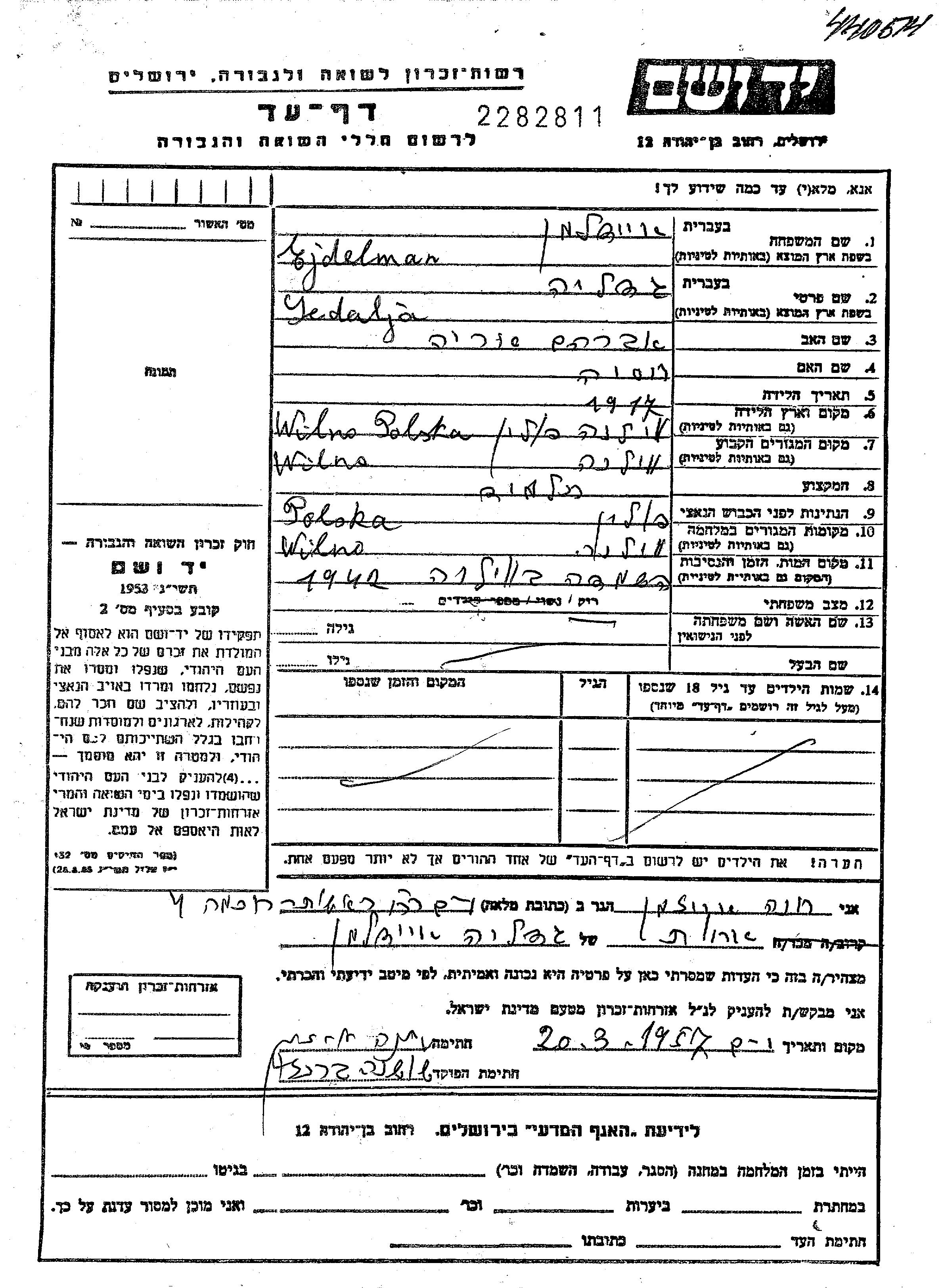 Gedalia Ejdelman wurde im Jahr 1917 in Wilno, Polen geboren. Vor dem Zweiten Weltkrieg lebte er in Wilno, Polen.